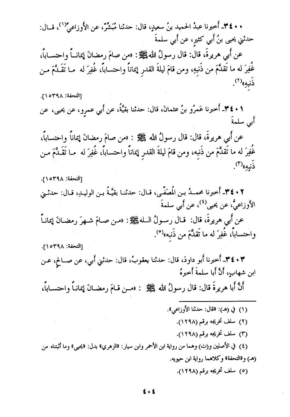 3400 - أَخْبَرَنَا عَبْدُ الْحَمِيدِ بْنُ سَعِيدٍ قَالَ: حَدَّثَنَا مُبَشِّرٌ، عَنِ الْأَوْزَاعِيِّ قَالَ: حَدَّثَنِي يَحْيَى بْنُ أَبِي كَثِيرٍ، عَنْ أَبِي سَلَمَةَ، عَنْ أَبِي هُرَيْرَةَ قَالَ: قَالَ رَسُولُ اللهِ صَلَّى اللهُ عَلَيْهِ وَسَلَّمَ: «§مَنْ صَامَ رَمَضَانَ إِيمَانًا وَاحْتِسَابًا غُفِرَ لَهُ مَا تَقَدَّمَ مِنْ ذَنْبِهِ، وَمَنْ قَامَ لَيْلَةَ الْقَدْرِ إِيمَانًا وَاحْتِسَابًا غُفِرَ لَهُ مَا تَقَدَّمَ مِنْ ذَنْبِهِ»