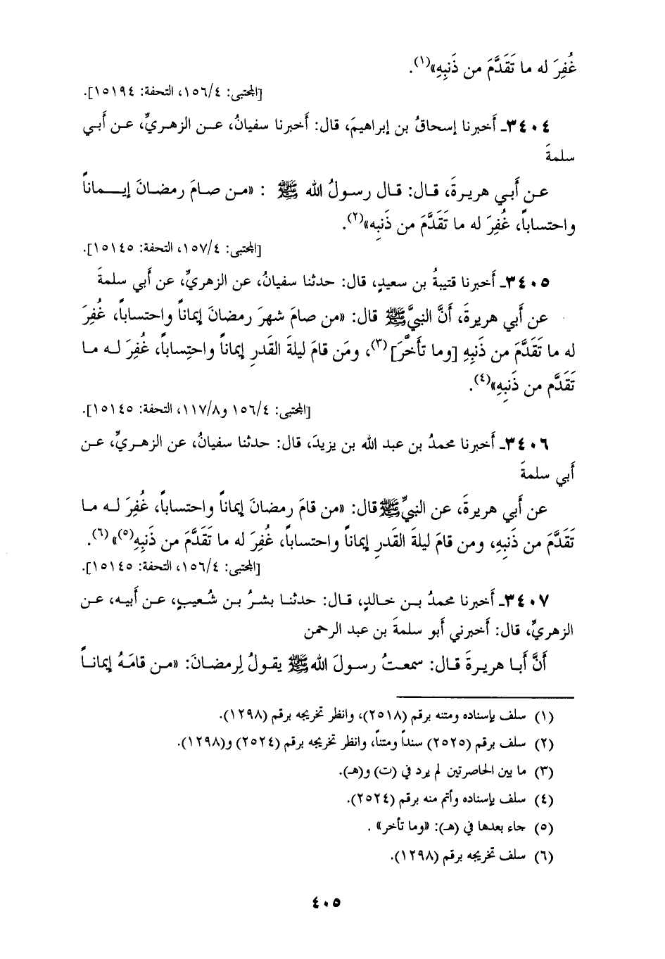 3405 - أَخْبَرَنَا قُتَيْبَةُ بْنُ سَعِيدٍ قَالَ: حَدَّثَنَا سُفْيَانُ، عَنِ الزُّهْرِيِّ، عَنْ أَبِي سَلَمَةَ، عَنْ أَبِي هُرَيْرَةَ، أَنَّ النَّبِيَّ صَلَّى اللهُ عَلَيْهِ وَسَلَّمَ قَالَ: «§مَنْ صَامَ شَهْرَ رَمَضَانَ إِيمَانًا وَاحْتِسَابًا غُفِرَ لَهُ مَا تَقَدَّمَ مِنْ ذَنْبِهِ، وَمَا تَأَخَّرَ وَمَنْ قَامَ لَيْلَةَ الْقَدْرِ إِيمَانًا وَاحْتِسَابًا غُفِرَ لَهُ مَا تَقَدَّمَ مِنْ ذَنْبِهِ»