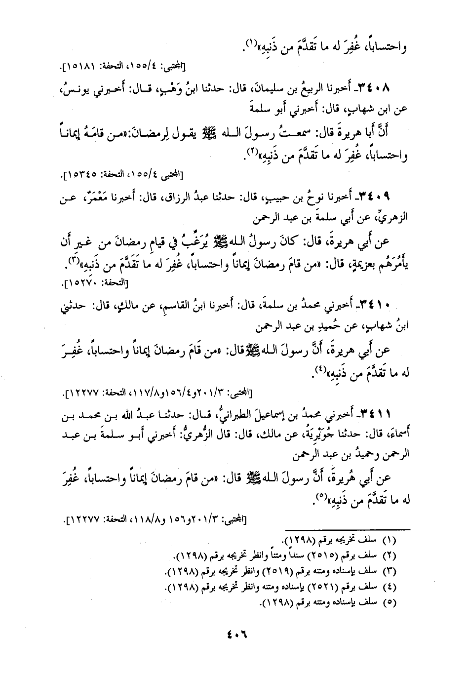 3410 - أَخْبَرَنِي مُحَمَّدُ بْنُ سَلَمَةَ قَالَ: أَخْبَرَنَا ابْنُ الْقَاسِمِ، عَنْ مَالِكٍ قَالَ: حَدَّثَنِي ابْنُ شِهَابٍ، عَنْ حُمَيْدِ بْنِ عَبْدِ الرَّحْمَنِ، عَنْ أَبِي هُرَيْرَةَ، أَنَّ رَسُولَ اللهِ صَلَّى اللهُ عَلَيْهِ وَسَلَّمَ قَالَ: «§مَنْ قَامَ رَمَضَانَ إِيمَانًا وَاحْتِسَابًا غُفِرَ لَهُ مَا تَقَدَّمَ مِنْ ذَنْبِهِ»