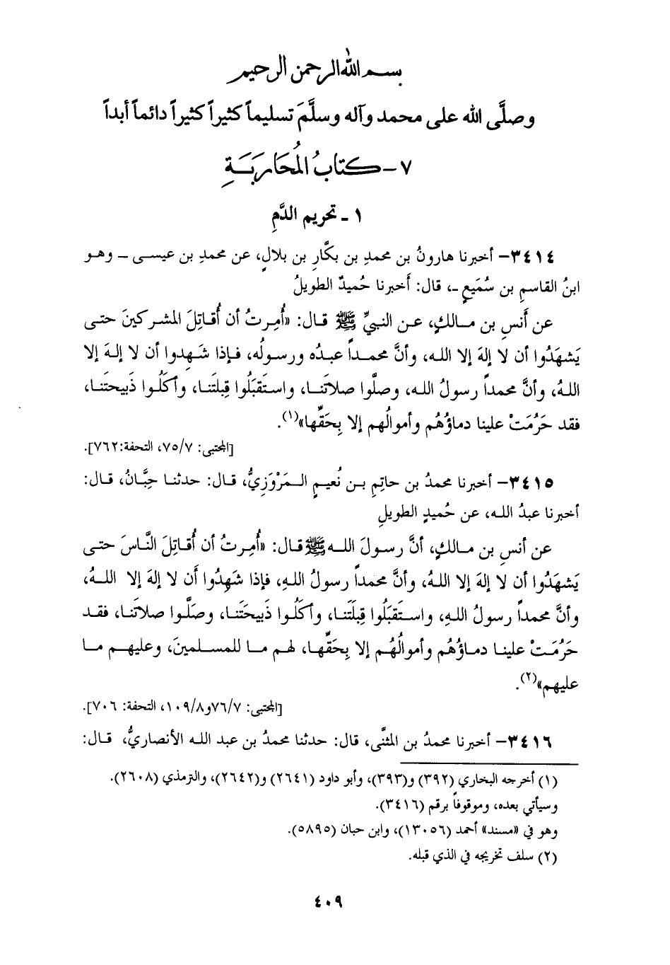 3414 - أَخْبَرَنَا هَارُونُ بْنُ مُحَمَّدِ بْنِ بَكَّارِ بْنِ بِلَالٍ، عَنْ مُحَمَّدِ بْنِ عِيسَى وَهُوَ ابْنُ الْقَاسِمِ بْنِ سُمَيْعٍ قَالَ: أَخْبَرَنَا حُمَيْدٌ الطَّوِيلُ، عَنْ أَنَسِ بْنِ مَالِكٍ، عَنِ النَّبِيِّ صَلَّى اللهُ عَلَيْهِ وَسَلَّمَ قَالَ: «§أُمِرْتُ أَنْ أُقَاتِلَ الْمُشْرِكِينَ حَتَّى يَشْهَدُوا أَنْ لَا إِلَهَ إِلَّا اللهُ وَأَنَّ مُحَمَّدًا عَبْدُهُ وَرَسُولُهُ، فَإِذَا شَهِدُوا أَنْ لَا إِلَهَ إِلَّا اللهُ وَأَنَّ مُحَمَّدًا رَسُولُ اللهِ، وَصَلَّوْا صَلَاتَنَا، وَاسْتَقْبَلُوا قِبْلَتَنَا وَأَكَلُوا ذَبِيحَتَنَا، فَقَدْ حَرُمَتْ عَلَيْنَا دِمَاؤُهُمْ وَأَمْوَالُهُمْ إِلَّا بِحَقِّهَا»