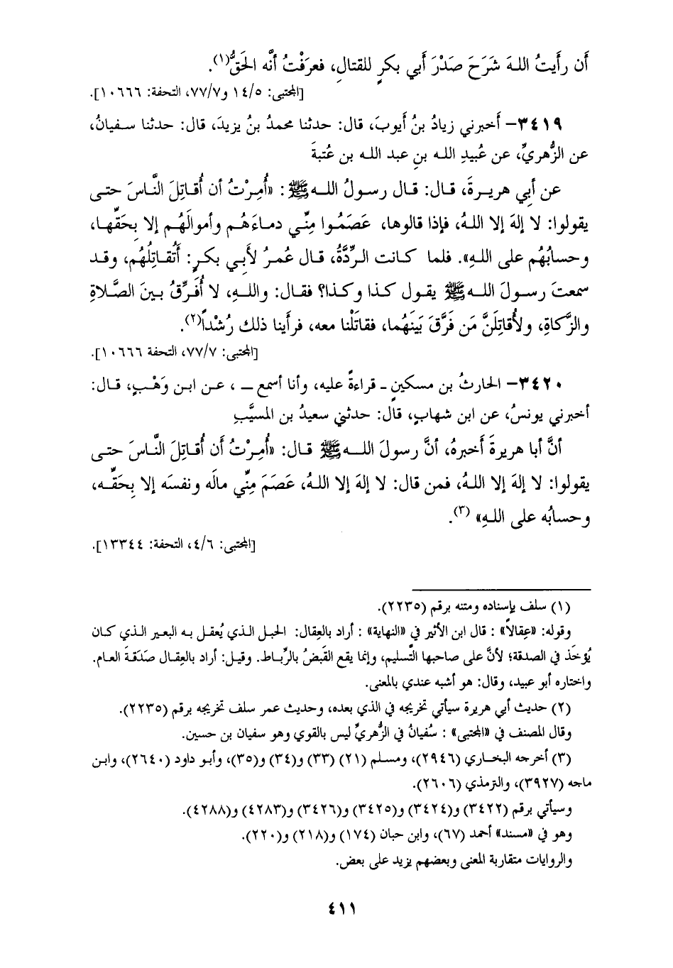 3419 - أَخْبَرَنِي زِيَادُ بْنُ أَيُّوبَ قَالَ: حَدَّثَنَا مُحَمَّدُ بْنُ يَزِيدَ قَالَ: حَدَّثَنَا سُفْيَانُ، عَنِ الزُّهْرِيِّ، عَنْ عُبَيْدِ اللهِ بْنِ عَبْدِ اللهِ بْنِ عُتْبَةَ، عَنْ أَبِي هُرَيْرَةَ قَالَ: قَالَ رَسُولُ اللهِ صَلَّى اللهُ عَلَيْهِ وَسَلَّمَ: «§أُمِرْتُ أَنْ أُقَاتِلَ النَّاسَ حَتَّى يَقُولُوا لَا إِلَهَ إِلَّا اللهُ، فَإِذَا قَالُوهَا عَصَمُوا مِنِّي دِمَاءَهُمْ وَأَمْوَالَهُمْ إِلَّا بِحَقِّهَا وَحِسَابُهُمْ عَلَى اللهِ» فَلَمَّا كَانَتِ الرِّدَّةُ، قَالَ عُمَرُ لِأَبِي بَكْرٍ: أَتُقَاتِلُهُمْ وَقَدْ سَمِعْتَ رَسُولَ اللهِ صَلَّى اللهُ عَلَيْهِ وَسَلَّمَ يَقُولُ كَذَا وَكَذَا، فَقَالَ: وَاللهِ لَا أُفَرِّقَ بَيْنَ الصَّلَاةِ وَالزَّكَاةِ، وَلَأُقَاتِلَنَّ مَنْ فَرَّقَ بَيْنَهُمَا، فَقَاتَلْنَا مَعَهُ فَرَأَيْنَا ذَلِكَ رُشْدًا