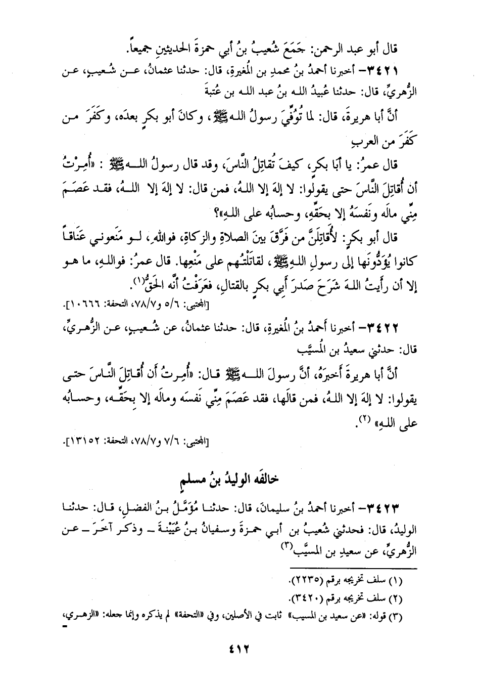 3422 - أَخْبَرَنَا أَحْمَدُ بْنُ الْمُغِيرَةِ قَالَ: حَدَّثَنَا عُثْمَانُ، عَنْ شُعَيْبٍ، عَنِ الزُّهْرِيِّ قَالَ: حَدَّثَنِي سَعِيدُ بْنُ الْمُسَيِّبِ، أَنَّ أَبَا هُرَيْرَةَ، أَخْبَرَهُ أَنَّ رَسُولَ اللهِ صَلَّى اللهُ عَلَيْهِ وَسَلَّمَ قَالَ: «§أُمِرْتُ أَنْ أُقَاتِلَ النَّاسَ حَتَّى يَقُولُوا لَا إِلَهَ إِلَّا اللهُ، فَمَنْ قَالَهَا فَقَدْ عَصَمَ مِنِّي نَفْسَهُ وَمَالَهُ إِلَّا بِحَقِّهِ وَحِسَابُهُ عَلَى اللهِ» خَالَفَهُ الْوَلِيدُ بْنُ مُسْلِمٍ