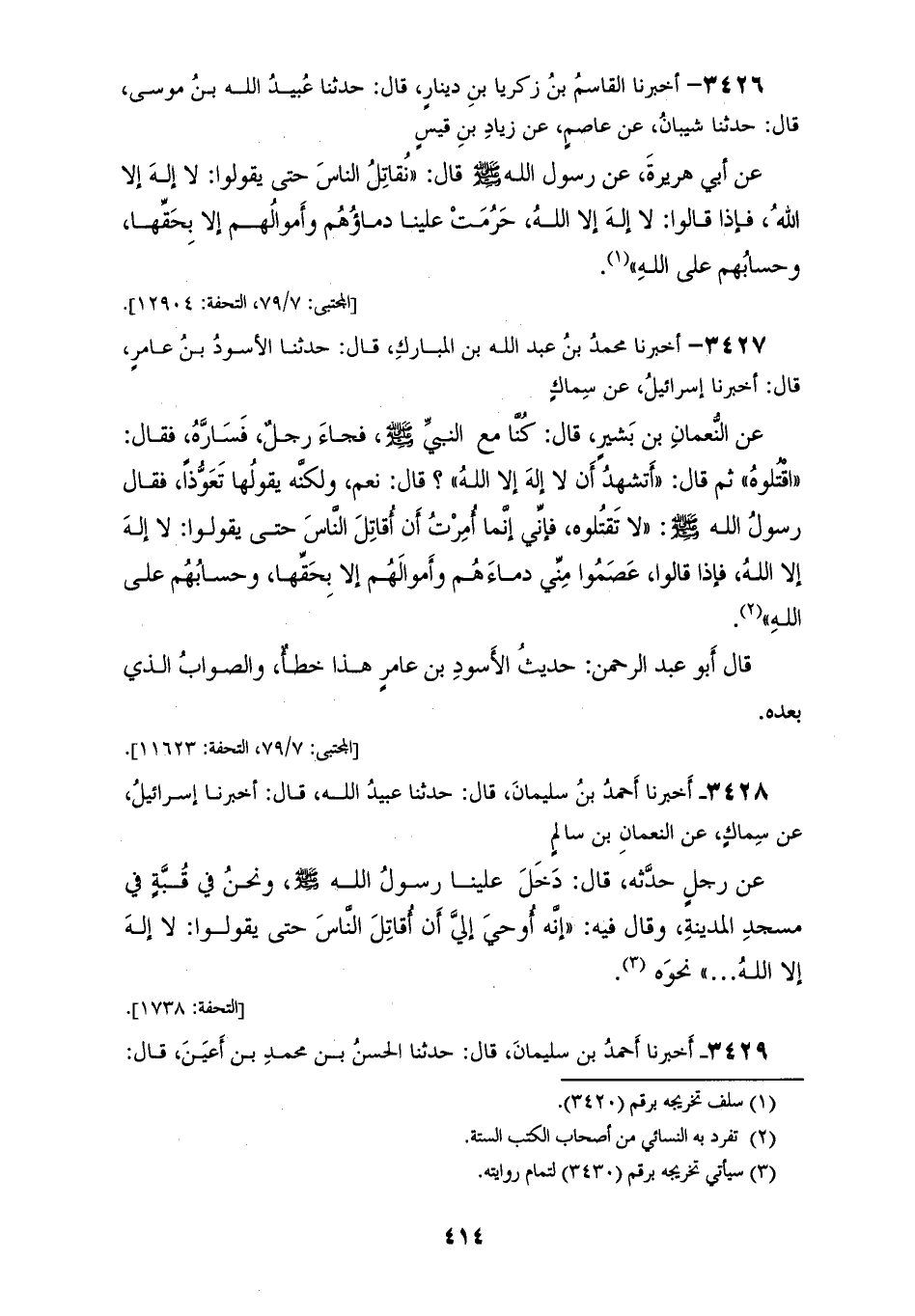 3427 - أَخْبَرَنَا مُحَمَّدُ بْنُ عَبْدِ اللهِ بْنِ الْمُبَارَكِ قَالَ: حَدَّثَنَا الْأَسْوَدُ بْنُ عَامِرٍ قَالَ: أَخْبَرَنَا إِسْرَائِيلُ، عَنْ سِمَاكٍ، عَنِ النُّعْمَانِ بْنِ بَشِيرٍ قَالَ: كُنَّا مَعَ النَّبِيِّ صَلَّى اللهُ عَلَيْهِ وَسَلَّمَ فَجَاءَ رَجُلٌ فَسَارَّهُ، فَقَالَ: «اقْتُلُوهُ» ثُمَّ قَالَ: «أَتَشْهَدُ أَنْ لَا إِلَهَ إِلَّا اللهُ؟» قَالَ: نَعَمْ، وَلَكِنَّهُ يَقُولُهَا تَعَوُّذًا، فَقَالَ رَسُولُ اللهِ صَلَّى اللهُ عَلَيْهِ وَسَلَّمَ: «§لَا تَقْتُلُوهُ فَإِنِّي إِنَّمَا أُمِرْتُ أَنْ أُقَاتِلَ النَّاسَ حَتَّى يَقُولُوا لَا إِلَهَ إِلَّا اللهُ، فَإِذَا قَالُوا عَصَمُوا مِنِّي دِمَاءَهُمْ وَأَمْوَالَهُمْ إِلَّا بِحَقِّهَا وَحِسَابُهُمْ عَلَى اللهِ» قَالَ أَبُو عَبْدِ الرَّحْمَنِ: حَدِيثُ الْأَسْوَدِ بْنِ عَامِرٍ هَذَا خَطَأٌ، وَالصَّوَابُ الَّذِي بَعْدَهُ.