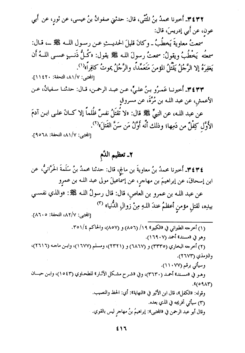 3434 - أَخْبَرَنَا مُحَمَّدُ بْنُ مُعَاوِيَةَ بْنِ مَالَجَ قَالَ: حَدَّثَنَا مُحَمَّدُ بْنُ سَلَمَةَ الْحَرَّانِيُّ، عَنِ ابْنِ إِسْحَاقَ، عَنْ إِبْرَاهِيمَ بْنِ مُهَاجِرٍ، عَنْ إِسْمَاعِيلَ، مَوْلَى عَبْدِ اللهِ بْنِ عَمْرٍو، عَنْ عَبْدِ اللهِ بْنِ عَمْرِو بْنِ الْعَاصِ قَالَ: قَالَ رَسُولُ اللهِ صَلَّى اللهُ عَلَيْهِ وَسَلَّمَ: «§وَالَّذِي نَفْسِي بِيَدِهِ لَقَتْلُ مُؤْمِنٍ أَعْظَمُ عِنْدَ اللهِ مِنْ زَوَالِ الدُّنْيَا»