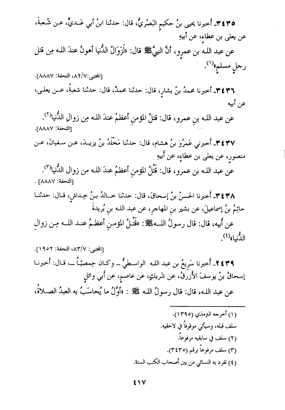 3435 - أَخْبَرَنَا يَحْيَى بْنُ حَكِيمٍ الْبَصْرِيُّ قَالَ: حَدَّثَنَا ابْنُ أَبِي عَدِيٍّ، عَنْ شُعْبَةَ، عَنْ يَعْلَى بْنِ عَطَاءٍ، عَنْ أَبِيهِ، عَنْ عَبْدِ اللهِ بْنِ عَمْرٍو، أَنَّ النَّبِيِّ صَلَّى اللهُ عَلَيْهِ وَسَلَّمَ قَالَ: «§لَزَوَالُ الدُّنْيَا أَهْوَنُ عِنْدَ اللهِ مِنْ قَتْلِ رَجُلٍ مُسْلِمٍ»