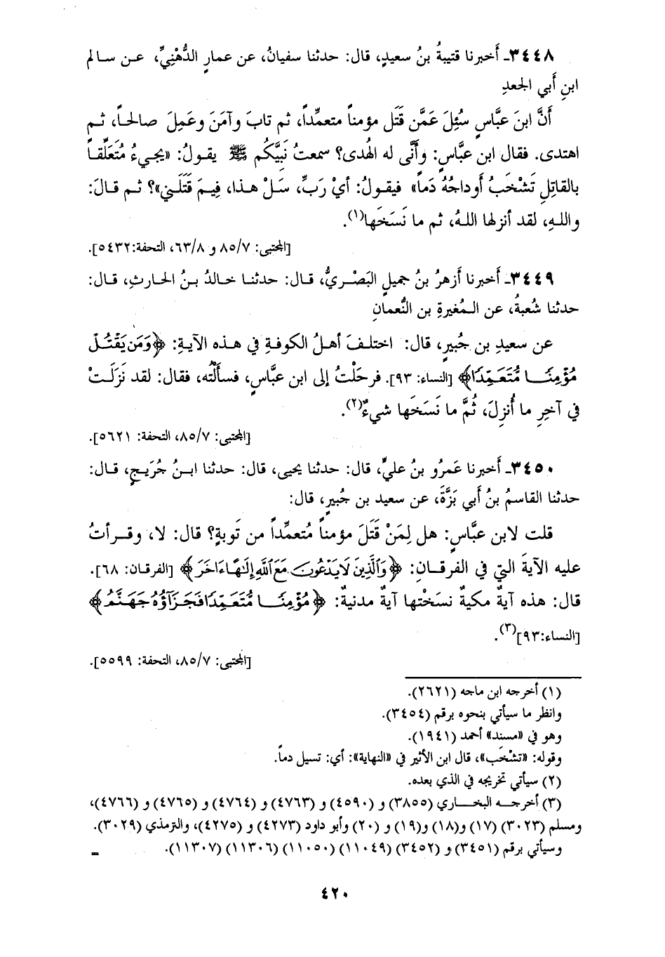 3448 - أَخْبَرَنَا قُتَيْبَةُ بْنُ سَعِيدٍ قَالَ: حَدَّثَنَا سُفْيَانُ، عَنْ عَمَّارٍ الدُّهْنِيِّ، عَنْ سَالِمِ بْنِ أَبِي الْجَعْدِ، أَنَّ ابْنَ عَبَّاسٍ، سُئِلَ عَمَّنْ قَتَلَ مُؤْمِنًا مُتَعَمِّدًا ثُمَّ تَابَ وَآمَنَ وَعَمَلَ صَالِحًا ثُمَّ اهْتَدَى، فَقَالَ ابْنُ عَبَّاسٍ وَأَنَّى لَهُ الْهُدَى، سَمِعْتُ نَبِيَّكُمْ صَلَّى اللهُ عَلَيْهِ وَسَلَّمَ يَقُولُ: " §يَجِيءُ مُتَعَلِّقًا بِالْقَاتِلِ تَشْخَبُ أَوْدَاجُهُ دَمًا، فَيَقُولُ: أَيْ رَبِّ، سَلْ هَذَا فِيمَ قَتَلَنِي؟ " ثُمَّ قَالَ: وَاللهِ لَقَدْ أَنْزَلَهَا اللهُ ثُمَّ مَا نَسَخَهَا "
