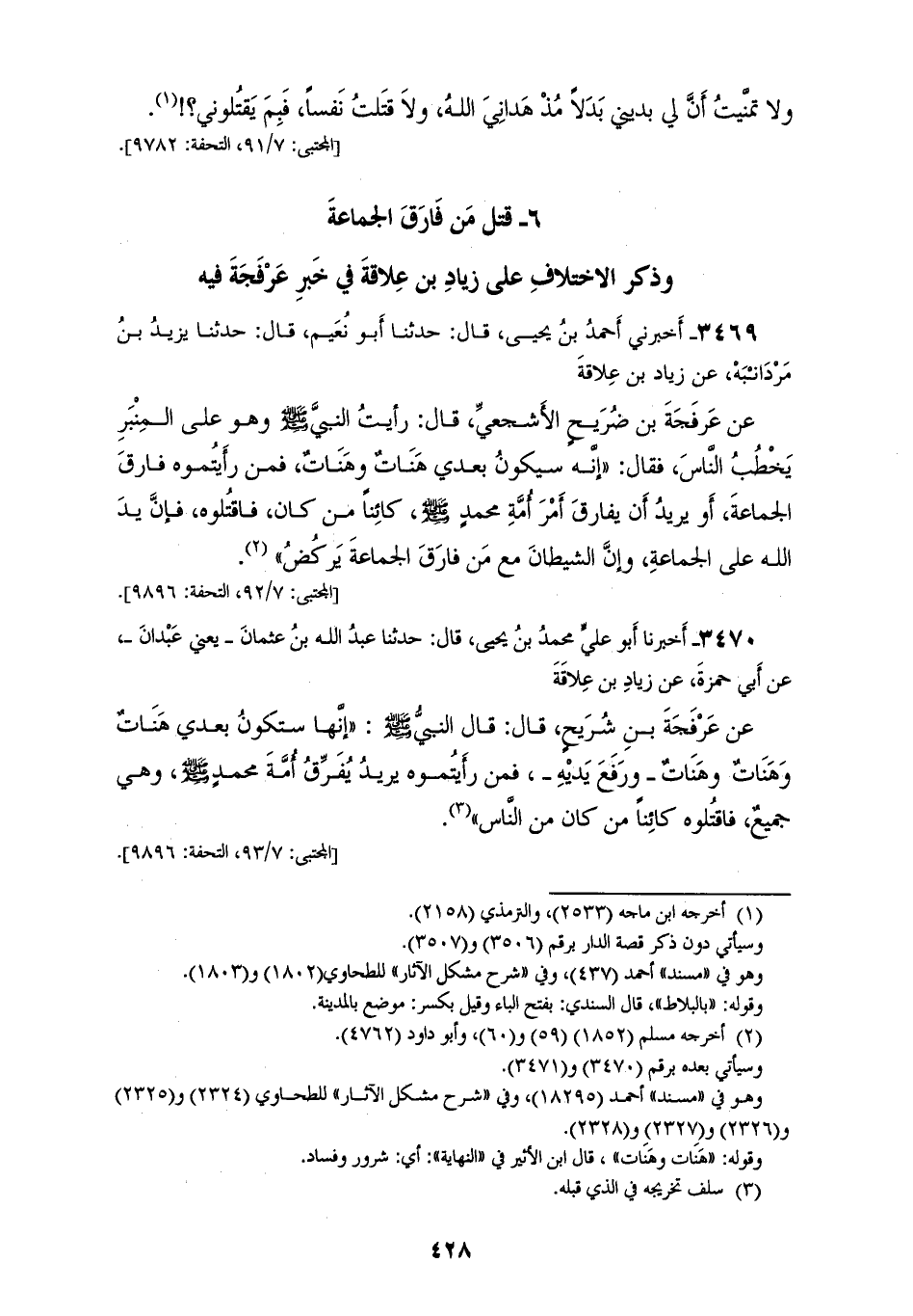 3470 - أَخْبَرَنَا أَبُو عَلِيٍّ مُحَمَّدُ بْنُ يَحْيَى قَالَ: حَدَّثَنَا عَبْدُ اللهِ بْنُ عُثْمَانَ يَعْنِي عَبْدَانَ، عَنْ أَبِي حَمْزَةَ، عَنْ زِيَادِ بْنِ عِلَاقَةَ، عَنْ عَرْفَجَةَ بْنِ شُرَيْحٍ قَالَ: قَالَ النَّبِيُّ صَلَّى اللهُ عَلَيْهِ وَسَلَّمَ: «§إِنَّهَا سَتَكُونُ بَعْدِي هَنَاتٌ وَهَنَاتٌ وَهَنَاتٌ وَرَفَعَ يَدَيْهِ فَمَنْ رَأَيْتُمُوهُ يُرِيدُ يُفَرِّقُ أُمَّةَ مُحَمَّدٍ صَلَّى اللهُ عَلَيْهِ وَسَلَّمَ وَهِيَ جَمِيعٌ فَاقْتُلُوهُ كَائِنًا مَنْ كَانَ مِنَ النَّاسِ»