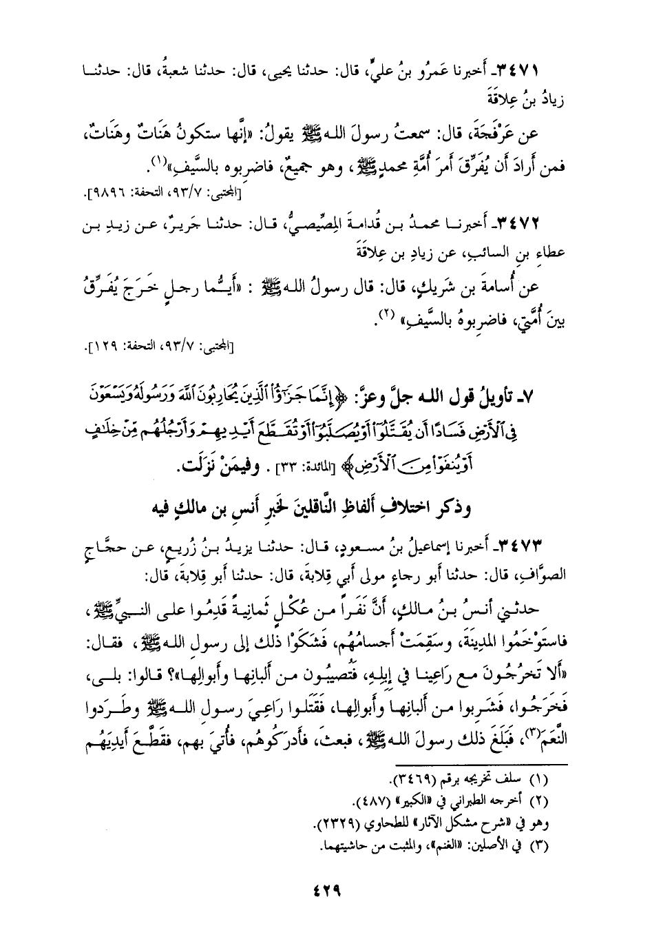 §تَأْوِيلُ قَوْلِ اللهِ عَزَّ وَجَلّ {إِنَّمَا جَزَاءُ الَّذِينَ يُحَارِبُونَ اللهَ وَرَسُولَهُ وَيَسْعَوْنَ فِي الْأَرْضِ فَسَادًا أَنْ يُقَتَّلُوا أَوْ يُصَلَّبُوا أَوْ تُقَطَّعَ أَيْدِيهِمْ وَأَرْجُلُهُمْ مِنْ خِلَافٍ أَوْ يُنْفَوْا مِنَ الْأَرْضِ} [المائدة: 33] وَفِيمَنْ نَزَلَتْ، وَذِكْرُ اخْتِلَافِ أَلْفَاظِ النَّاقِلِينَ لِخَبَرِ أَنَسِ بْنِ مَالِكٍ فِيهِ
