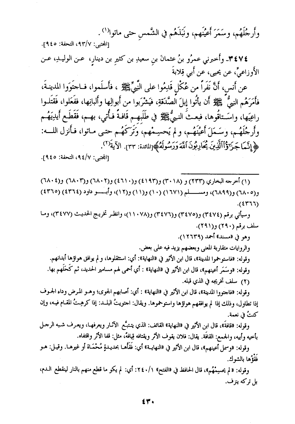 3474 - وَأَخْبَرَنِي عَمْرُو بْنُ عُثْمَانَ بْنِ سَعِيدِ بْنِ كَثِيرِ بْنِ دِينَارٍ، عَنِ الْوَلِيدِ، عَنِ الْأَوْزَاعِيِّ، عَنْ يَحْيَى، عَنْ أَبِي قِلَابَةَ، عَنْ أَنَسٍ، أَنَّ نَفَرًا، مِنْ عُكْلٍ قَدِمُوا عَلَى النَّبِيِّ صَلَّى اللهُ عَلَيْهِ وَسَلَّمَ فَأَسْلَمُوا فَاجْتَوَوُا الْمَدِينَةَ، فَأَمَرَهُمْ النَّبِيُّ صَلَّى اللهُ عَلَيْهِ وَسَلَّمَ أَنْ يَأْتُوا إِبِلَ الصَّدَقَةِ، فَيَشْرَبُوا مِنْ أَبْوَالِهَا وَأَلْبَانِهَا، فَفَعَلُوا فَقَتَلُوا رَاعِيَهَا وَاسْتَاقُوهَا، فَبَعَثَ النَّبِيُّ صَلَّى اللهُ عَلَيْهِ وَسَلَّمَ فِي طَلَبِهِمْ قَافَةً: «§فَأُتِيَ بِهِمْ، فَقَطَّعَ أَيْدِيَهُمْ وَأَرْجُلَهُمْ، وَسَمَلَ أَعْيُنَهُمْ، وَلَمْ يَحْسِمْهُمْ، وَتَرَكَهُمْ حَتَّى مَاتُوا»، فَأَنْزَلَ اللهُ: {إِنَّمَا جَزَاءُ الَّذِينَ يُحَارِبُونَ اللهَ وَرَسُولَهُ} [المائدة: 33] الْآيَةَ