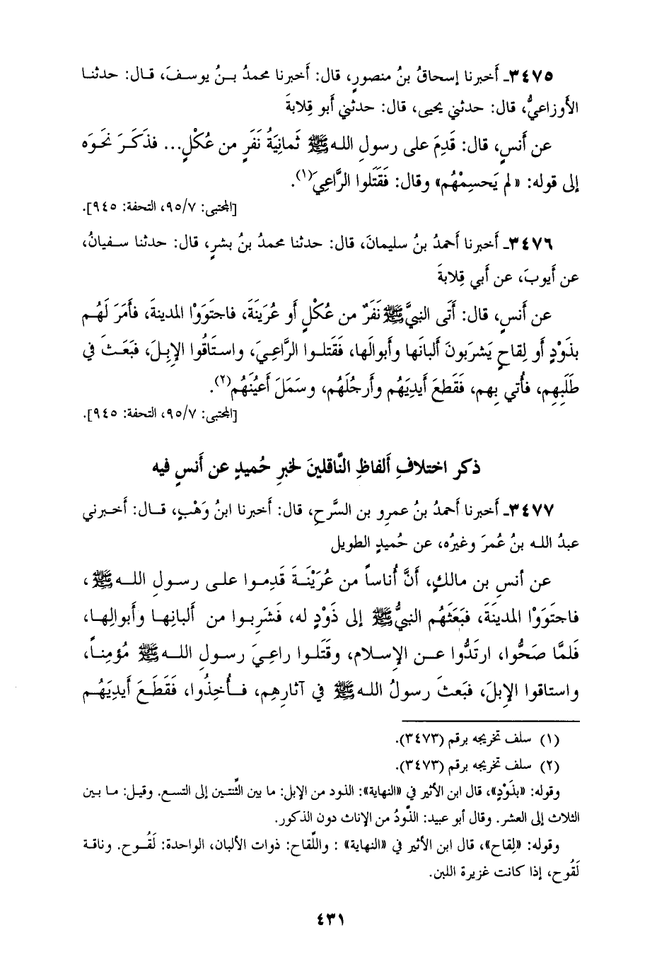 3477 - أَخْبَرَنَا أَحْمَدُ بْنُ عَمْرِو بْنِ السَّرْحِ قَالَ: أَخْبَرَنَا ابْنُ وَهْبٍ قَالَ: أَخْبَرَنِي عَبْدُ اللهِ بْنُ عُمَرَ، وَغَيْرُهُ، عَنْ حُمَيْدٍ الطَّوِيلِ، عَنْ أَنَسِ بْنِ مَالِكٍ، «§أَنَّ أُنَاسًا مِنْ عُرَيْنَةَ قَدِمُوا عَلَى رَسُولِ اللهِ صَلَّى اللهُ عَلَيْهِ وَسَلَّمَ، فَاجْتَوَوُا الْمَدِينَةَ فَبَعَثَهُمْ النَّبِيُّ صَلَّى اللهُ عَلَيْهِ وَسَلَّمَ إِلَى ذَوْدٍ لَهُ فَشَرِبُوا مِنْ أَلْبَانِهَا وَأَبْوَالِهَا، فَلَمَّا صَحُّوا ارْتَدُّوا عَنْ الْإِسْلَامِ وَقَتَلُوا رَاعِيَ رَسُولِ اللهِ صَلَّى اللهُ عَلَيْهِ وَسَلَّمَ مُؤْمِنًا، وَاسْتَاقُوا الْإِبِلَ فَبَعَثَ رَسُولُ اللهِ صَلَّى اللهُ عَلَيْهِ وَسَلَّمَ فِي آثَارِهِمْ فَأُخِذُوا، فَقَطَّعَ أَيْدِيَهُمْ وَأَرْجُلَهُمْ وَسَمَلَ أَعْيُنَهُمْ وَصَلَبَهُمْ»