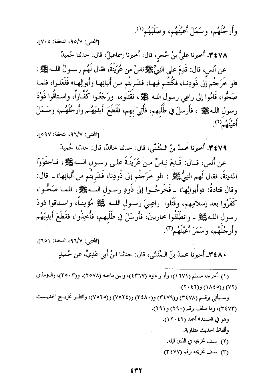 3478 - أَخْبَرَنَا عَلِيُّ بْنُ حُجْرٍ قَالَ: أَخْبَرَنَا إِسْمَاعِيلُ، قَالَ: حَدَّثَنَا حُمَيْدٍ، عَنْ أَنَسٍ قَالَ: قَدِمَ عَلَى النَّبِيِّ صَلَّى اللهُ عَلَيْهِ وَسَلَّمَ نَاسٌ مِنْ عُرَيْنَةَ، فَقَالَ لَهُمْ رَسُولُ اللهِ صَلَّى اللهُ عَلَيْهِ وَسَلَّمَ: «§لَوْ خَرَجْتُمْ إِلَى ذَوْدِنَا فَكُنْتُمْ فِيهَا فَشَرِبْتُمْ مِنْ أَلْبَانِهَا وَأَبْوَالِهَا» فَفَعَلُوا، فَلَمَّا صَحُّوا قَامُوا إِلَى رَاعِي رَسُولِ اللهِ صَلَّى اللهُ عَلَيْهِ وَسَلَّمَ فَقَتَلُوهُ وَرَجَعُوا كُفَّارًا، وَاسْتَاقُوا ذَوْدَ رَسُولِ اللهِ صَلَّى اللهُ عَلَيْهِ وَسَلَّمَ، فَأَرْسَلَ فِي طَلَبِهِمْ، فَأُتِيَ بِهِمْ فَقَطَّعَ أَيْدِيَهُمْ وَأَرْجُلَهُمْ، وَسَمَلَ أَعْيُنَهُمْ "