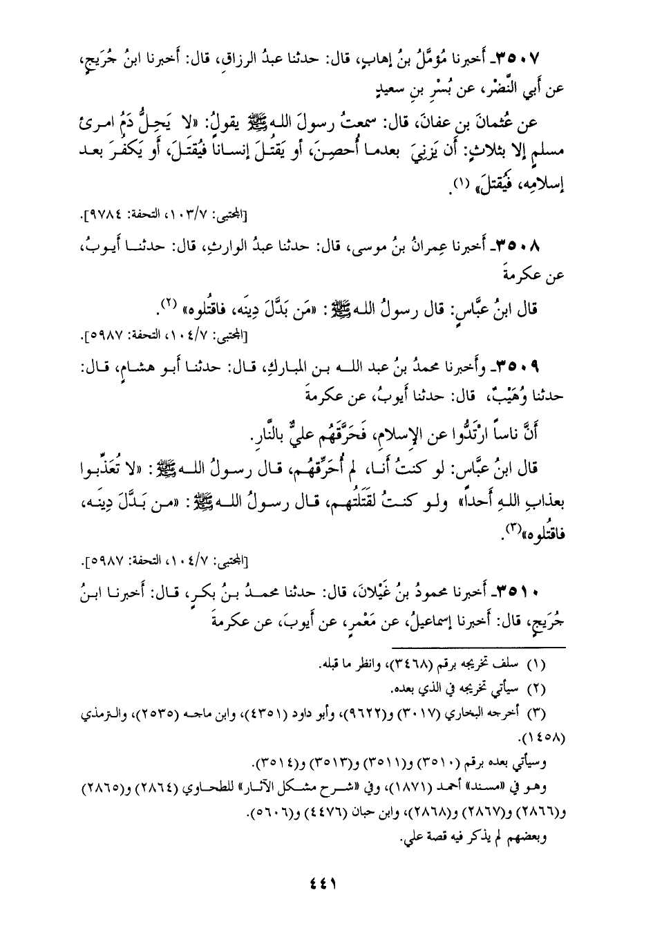 3510 - أَخْبَرَنَا مَحْمُودُ بْنُ غَيْلَانَ قَالَ: حَدَّثَنَا مُحَمَّدُ بْنُ بَكْرٍ، قَالَ أَخْبَرَنَا ابْنُ جُرَيْجٍ قَالَ: أَخْبَرَنَا إِسْمَاعِيلُ، عَنْ مَعْمَرٍ، عَنْ أَيُّوبَ، عَنْ عِكْرِمَةَ، عَنِ ابْنِ عَبَّاسٍ قَالَ: قَالَ رَسُولُ اللهِ صَلَّى اللهُ عَلَيْهِ وَسَلَّمَ: «§مَنْ بَدَّلَ دِينَهُ فَاقْتُلُوهُ»