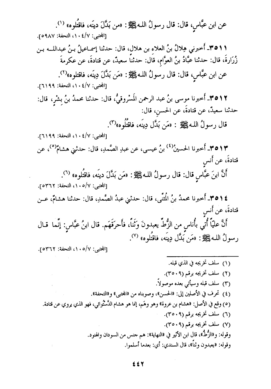 3514 - أَخْبَرَنَا مُحَمَّدُ بْنُ الْمُثَنَّى قَالَ: حَدَّثَنِي عَبْدُ الصَّمَدِ قَالَ: حَدَّثَنَا هِشَامٌ، عَنْ قَتَادَةَ، عَنْ أَنَسٍ، أَنَّ عَلِيًّا، أُتِيَ بِأُنَاسٍ مِنَ الزُّطِّ يَعْبُدُونَ وَثَنًا فَأَحْرَقَهُمْ، قَالَ ابْنُ عَبَّاسٍ: إِنَّمَا قَالَ رَسُولُ اللهِ صَلَّى اللهُ عَلَيْهِ وَسَلَّمَ: «§مَنْ بَدَّلَ دِينَهُ فَاقْتُلُوهُ»