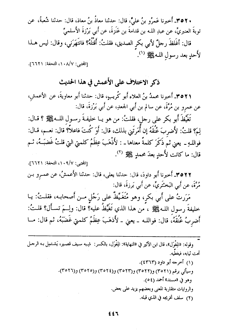3522 - أَخْبَرَنَا أَبُو دَاوُدَ قَالَ: حَدَّثَنَا يَعْلَى قَالَ: حَدَّثَنَا الْأَعْمَشُ، عَنْ عَمْرِو بْنِ مُرَّةَ، عَنْ أَبِي الْبَخْتَرِيِّ، عَنْ أَبِي بَرْزَةَ قَالَ: " §مَرَرْتُ عَلَى أَبِي بَكْرٍ وَهُوَ مُتَغَيِّظٌ عَلَى رَجُلٍ مِنْ أَصْحَابِهِ، فَقُلْتُ: يَا خَلِيفَةَ رَسُولِ اللهِ صَلَّى الله عَلَيْه وَسَلَّمَ مَنْ هَذَا الَّذِي تَغَيَّظُ عَلَيْهِ؟ قَالَ: وَلِمَ تَسْأَلُ؟ قُلْتُ: أَضْرِبُ عُنُقَهُ قَالَ: فَوَاللهِ - يَعْنِي - لَأَذْهَبَ عِظَمُ كَلِمَتِي غَضَبَهُ، ثُمَّ قَالَ: مَا كَانَتْ تِلْكَ لِأَحَدٍ بَعْدَ مُحَمَّدٍ صَلَّى اللهُ عَلَيْهِ وَسَلَّمَ "