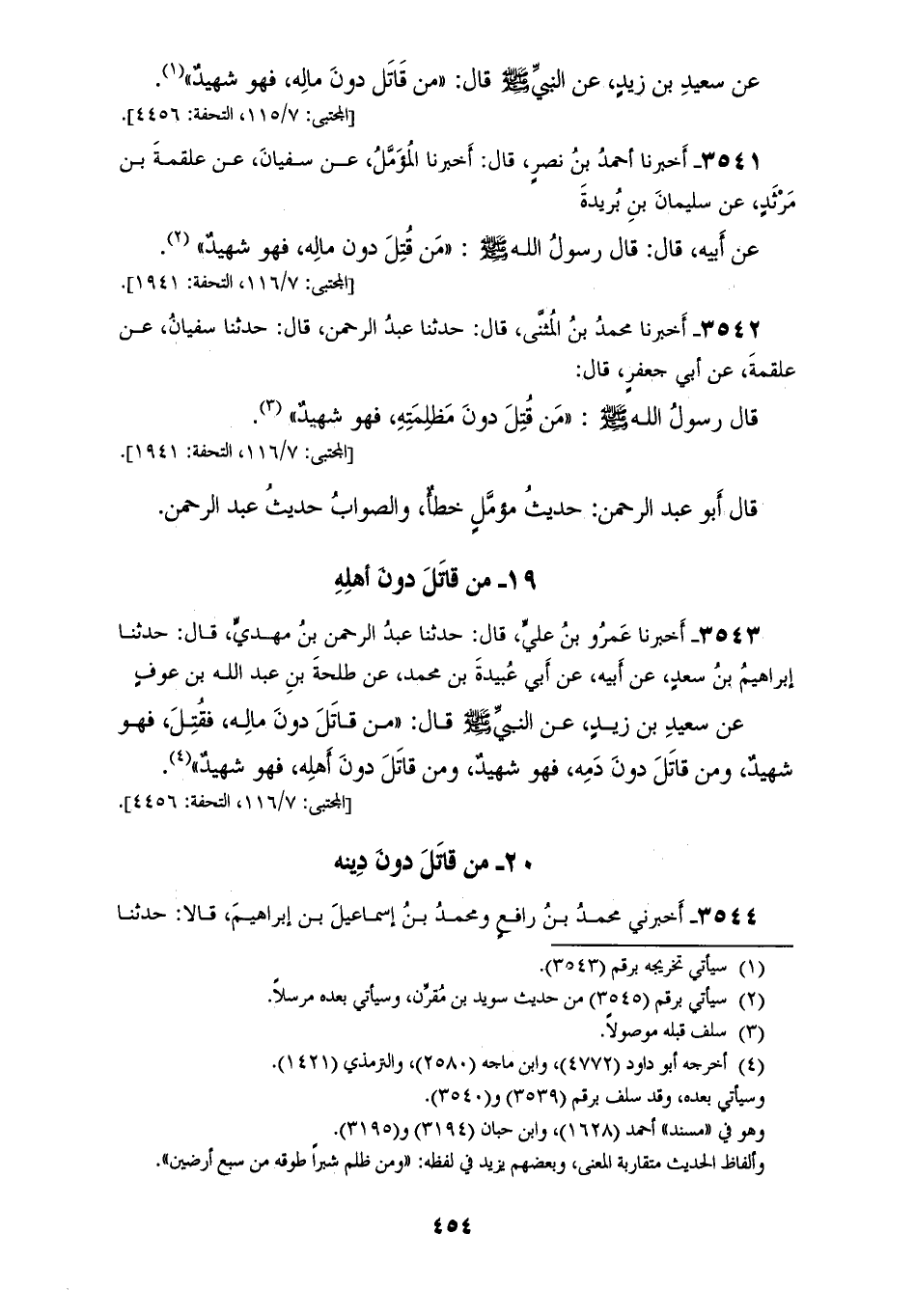 3543 - أَخْبَرَنَا عَمْرُو بْنُ عَلِيٍّ قَالَ: حَدَّثَنَا عَبْدُ الرَّحْمَنِ بْنُ مَهْدِيٍّ قَالَ: حَدَّثَنَا إِبْرَاهِيمُ بْنُ سَعْدٍ، عَنْ أَبِيهِ، عَنْ أَبِي عُبَيْدَةَ بْنِ مُحَمَّدٍ، عَنْ طَلْحَةَ بْنِ عَبْدِ اللهِ بْنِ عَوْفٍ، عَنْ سَعِيدِ بْنِ زَيْدٍ، عَنِ النَّبِيِّ صَلَّى اللهُ عَلَيْهِ وَسَلَّمَ قَالَ: «§مَنْ قَاتَلَ دُونَ مَالِهِ فَقُتِلَ فَهُوَ شَهِيدٌ، وَمَنْ قَاتَلَ دُونَ دَمِهِ فَهُوَ شَهِيدٌ، وَمَنْ قَاتَلَ دُونَ أَهْلِهِ، فَهُوَ شَهِيدٌ»