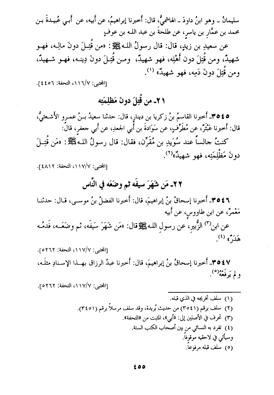 3544 - أَخْبَرَنِي مُحَمَّدُ بْنُ رَافِعٍ، وَمُحَمَّدُ بْنُ إِسْمَاعِيلَ بْنِ إِبْرَاهِيمَ قَالَا: حَدَّثَنَا سُلَيْمَانُ وَهُوَ ابْنُ دَاوُدَ الْهَاشِمِيَّ قَالَ: أَخْبَرَنَا إِبْرَاهِيمُ، عَنْ أَبِيهِ، عَنْ أَبِي عُبَيْدَةَ بْنِ مُحَمَّدِ بْنِ عَمَّارِ بْنِ يَاسِرٍ، عَنْ طَلْحَةَ بْنِ عَبْدِ اللهِ بْنِ عَوْفٍ، عَنْ سَعِيدِ بْنِ زَيْدٍ قَالَ: قَالَ رَسُولُ اللهِ صَلَّى اللهُ عَلَيْهِ وَسَلَّمَ: «§مَنْ قُتِلَ دُونَ مَالِهِ فَهُوَ شَهِيدٌ، وَمَنْ قُتِلَ دُونَ أَهْلِهِ فَهُوَ شَهِيدٌ، وَمَنْ قُتِلَ دُونَ دِينِهِ فَهُوَ شَهِيدٌ، وَمَنْ قُتِلَ دُونَ دَمِهِ فَهُوَ شَهِيدٌ»