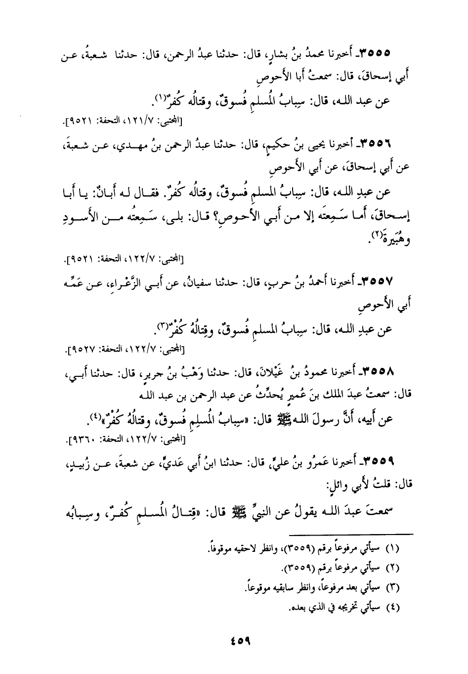 3555 - أَخْبَرَنَا مُحَمَّدُ بْنُ بَشَّارٍ قَالَ: حَدَّثَنَا عَبْدُ الرَّحْمَنِ قَالَ: حَدَّثَنَا شُعْبَةُ، عَنْ أَبِي إِسْحَاقَ قَالَ: سَمِعْتُ أَبَا الْأَحْوَصِ، عَنْ عَبْدِ اللهِ قَالَ: «§سِبَابُ الْمُسْلِمِ فُسُوقٌ، وَقِتَالُهُ كُفْرٌ»