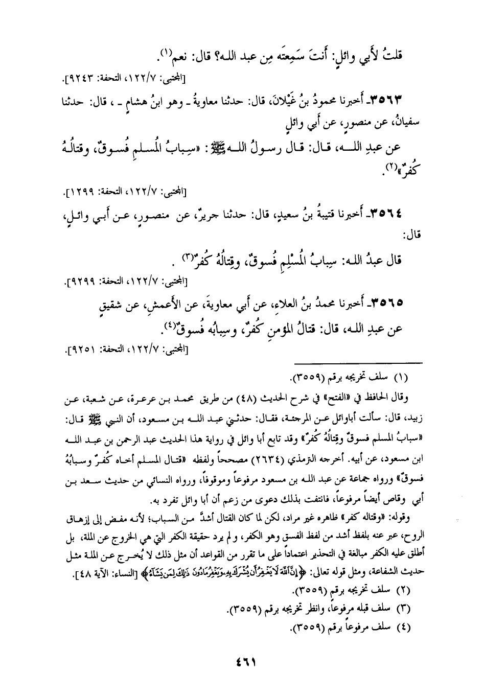 3564 - أَخْبَرَنَا قُتَيْبَةُ بْنُ سَعِيدٍ قَالَ: حَدَّثَنَا جَرِيرٌ، عَنْ مَنْصُورٍ، عَنْ أَبِي وَائِلٍ قَالَ: قَالَ عَبْدُ اللهِ: «§سِبَابُ الْمُسْلِمِ فُسُوقٌ وَقِتَالُهُ كُفْرٌ»
