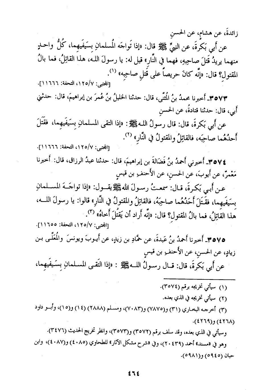 3575 - أَخْبَرَنَا أَحْمَدُ بْنُ عَبْدَةَ، عَنْ حَمَّادِ بْنِ زَيْدٍ، عَنْ أَيُّوبَ، وَيُونُسَ، وَالْمُعَلَّى بْنِ زِيَادٍ، عَنْ الْحَسَنِ، عَنْ الْأَحْنَفِ بْنِ قَيْسٍ، عَنْ أَبِي بَكْرَةَ قَالَ: قَالَ رَسُولُ اللهِ صَلَّى اللهُ عَلَيْهِ وَسَلَّمَ: «§إِذَا الْتَقَى الْمُسْلِمَانِ بِسَيْفَيْهِمَا فَقَتَلَ أَحَدُهُمَا صَاحِبَهُ فَالْقَاتِلُ وَالْمَقْتُولُ فِي النَّارِ»