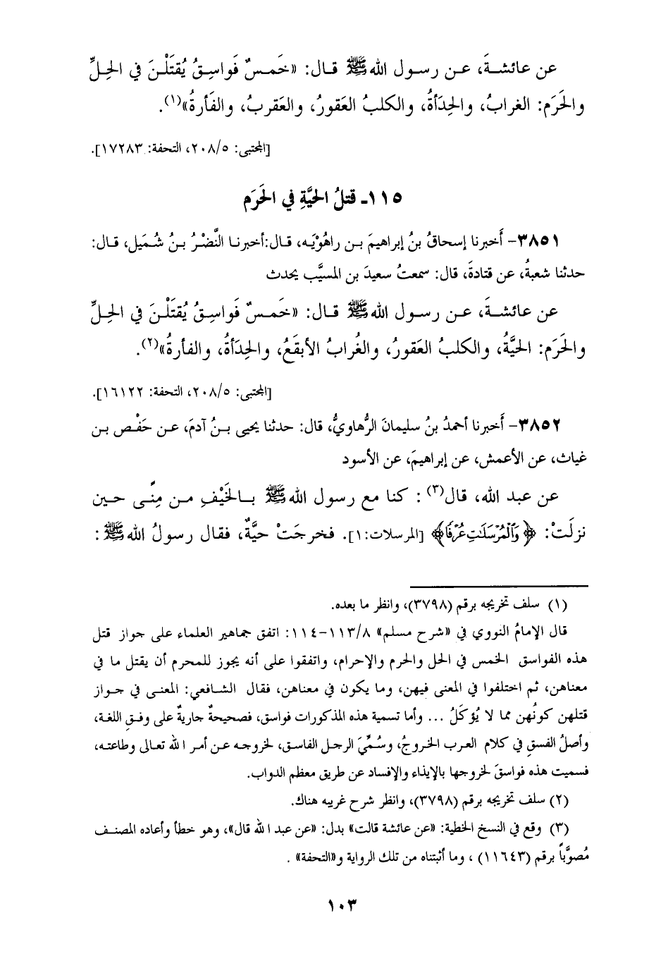 3852 - أَخْبَرَنَا أَحْمَدُ بْنُ سُلَيْمَانَ الرُّهَاوِيُّ، قَالَ: حَدَّثَنَا يَحْيَى بْنُ آدَمَ، عَنْ حَفْصِ بْنِ غِيَاثٍ، عَنِ الْأَعْمَشِ، عَنْ إِبْرَاهِيمَ، عَنِ الْأَسْوَدِ، عَنْ عَبْدِ اللهِ، قَالَ: كُنَّا مَعَ رَسُولِ اللهِ صَلَّى اللهُ عَلَيْهِ وَسَلَّمَ بِالْخَيْفِ مِنْ مِنًى §حِينَ نَزَلَتْ {وَالْمُرْسَلَاتِ عُرْفًا} [المرسلات: 1] فَخَرَجَتْ حَيَّةٌ، فَقَالَ رَسُولُ اللهِ صَلَّى اللهُ عَلَيْهِ وَسَلَّمَ: «اقْتُلُوهَا» فَابْتَدَرْنَاهَا فَدَخَلَتْ فِي جُحْرِهَا