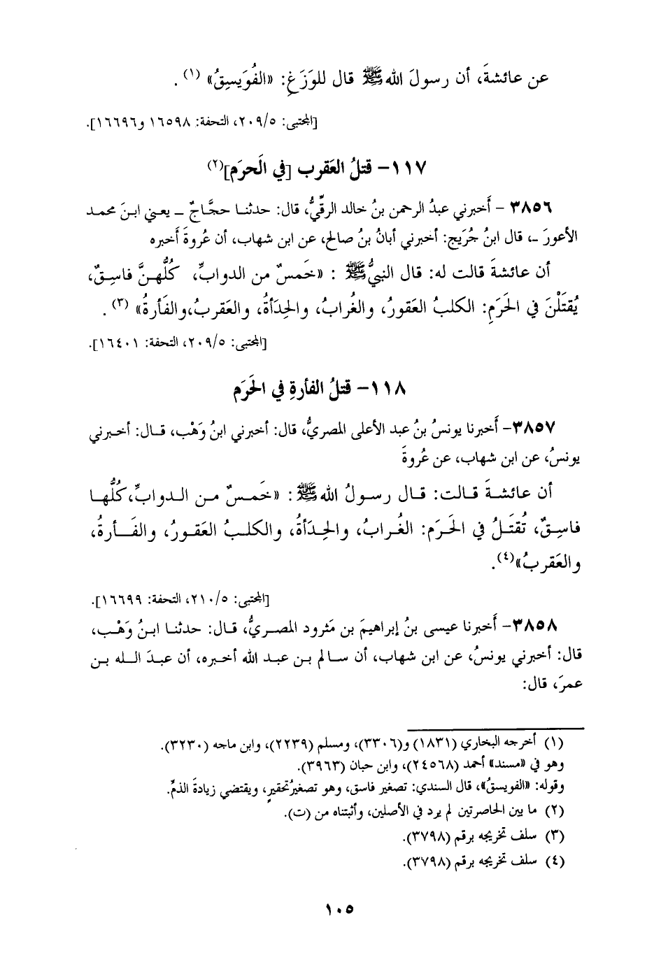 3857 - أَخْبَرَنَا يُونُسُ بْنُ عَبْدِ الْأَعْلَى الْمِصْرِيُّ، قَالَ: أَخْبَرَنِي ابْنُ وَهْبٍ قَالَ: أَخْبَرَنِي يُونُسُ، عَنِ ابْنِ شِهَابٍ، عَنْ عُرْوَةَ، أَنَّ عَائِشَةَ، قَالَتْ: قَالَ رَسُولُ اللهِ صَلَّى اللهُ عَلَيْهِ وَسَلَّمَ: " §خَمْسٌ مِنَ الدَّوَابِّ كُلُّهَا فَاسِقٌ تُقْتَلُ فِي الْحَرَمِ: الْغُرَابُ، وَالْحِدَأَةُ، وَالْكَلْبُ الْعَقُورُ، وَالْفَأْرَةُ، وَالْعَقْرَبُ "