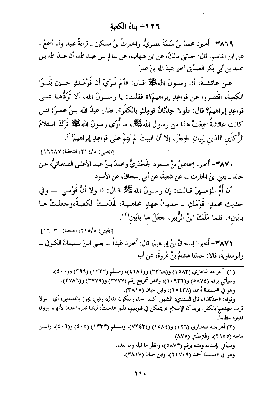 3869 - أَخْبَرَنَا مُحَمَّدُ بْنُ سَلَمَةَ الْمِصْرِيُّ، وَالْحَارِثُ بْنُ مِسْكِينٍ، قِرَاءَةً عَلَيْهِ وَأَنَا أَسْمَعُ، عَنِ ابْنِ الْقَاسِمِ، قَالَ: حَدَّثَنِي مَالِكٌ، عَنِ ابْنِ شِهَابٍ، عَنْ سَالِمِ بْنِ عَبْدِ اللهِ، أَنَّ عَبْدَ اللهِ بْنَ مُحَمَّدِ بْنِ أَبِي بَكْرٍ الصِّدِّيقِ، أَخْبَرَ عَبْدَ اللهِ بْنُ عُمَرَ، عَنْ عَائِشَةَ، أَنَّ رَسُولَ اللهِ صَلَّى اللهُ عَلَيْهِ وَسَلَّمَ قَالَ: «أَلَمْ تَرَيْ أَنَّ قَوْمَكِ حِينَ بَنَوَا الْكَعْبَةَ اقْتَصَرُوا عَنْ قَوَاعِدِ إِبْرَاهِيمَ؟» فَقُلْتُ: يَا رَسُولَ اللهِ، أَلَا تَرُدُّهَا عَلَى قَوَاعِدَ إِبْرَاهِيمَ، قَالَ: «§لَوْلَا حِدْثَانُ قَوْمِكِ بِالْكُفْرِ» فَقَالَ عَبْدُ اللهِ بْنُ عُمَرَ: لَئِنْ كَانَتْ عَائِشَةُ سَمِعَتْ هَذَا مِنْ رَسُولِ اللهِ صَلَّى اللهُ عَلَيْهِ وَسَلَّمَ مَا أَرَى رَسُولَ اللهِ صَلَّى اللهُ عَلَيْهِ وَسَلَّمَ تَرَكَ اسْتِلَامَ الرُّكْنَيْنِ اللَّذَيْنِ يَلِيَانِ الْحِجْرَ إِلَّا أَنَّ الْبَيْتَ لَمْ يَتِمَّ عَلَى قَوَاعِدِ إِبْرَاهِيمَ