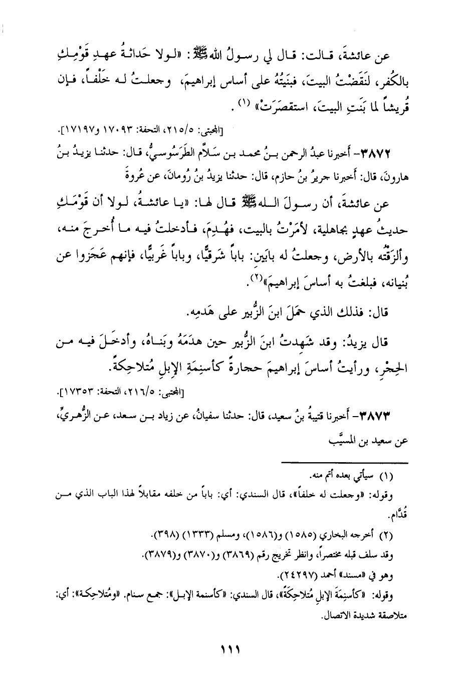 3872 - أَخْبَرَنَا عَبْدُ الرَّحْمَنِ بْنُ مُحَمَّدِ بْنِ سَلَّامٍ الطَّرَسُوسِيُّ، قَالَ: حَدَّثَنَا يَزِيدُ بْنُ هَارُونَ، قَالَ: أَخْبَرَنَا جَرِيرُ بْنُ حَازِمٍ، قَالَ: حَدَّثَنَا يَزِيدُ بْنُ رُومَانَ، عَنْ عُرْوَةَ، عَنْ عَائِشَةَ، أَنَّ رَسُولَ اللهِ صَلَّى اللهُ عَلَيْهِ وَسَلَّمَ قَالَ لَهَا: «يَا عَائِشَةُ، §لَوْلَا أَنَّ قَوْمَكِ حَدِيثُ عَهْدٍ بِجَاهِلِيَّةٍ لَأَمَرْتُ بِالْبَيْتِ فَهُدِمَ، فَأَدْخَلْتُ فِيهِ مَا أُخْرِجَ مِنْهُ، وَأَلْزَقْتُهُ بِالْأَرْضِ، وَجَعَلْتُ لَهُ بَابَيْنِ، بَابًا شَرْقِيًّا، وَبَابًا غَرْبِيًّا، فَإِنَّهُمْ عَجَزُوا عَنْ بُنْيَانِهِ، فَبَلَغْتُ بِهِ أَسَاسَ إِبْرَاهِيمَ». قَالَ: فَذَلِكَ الَّذِي حَمَلَ ابْنَ الزُّبَيْرِ عَلَى هَدْمِهِ، قَالَ يَزِيدُ: وَقَدْ شَهِدْتُ ابْنَ الزُّبَيْرِ حِينَ هَدَمَهُ وَبَنَاهُ وَأَدْخَلَ فِيهِ مِنَ الْحِجْرِ، وَرَأَيْتُ أَسَاسَ إِبْرَاهِيمَ حِجَارَةً كَأَسْنِمَةِ الْإِبِلِ مُتَلَاحِكَةً "