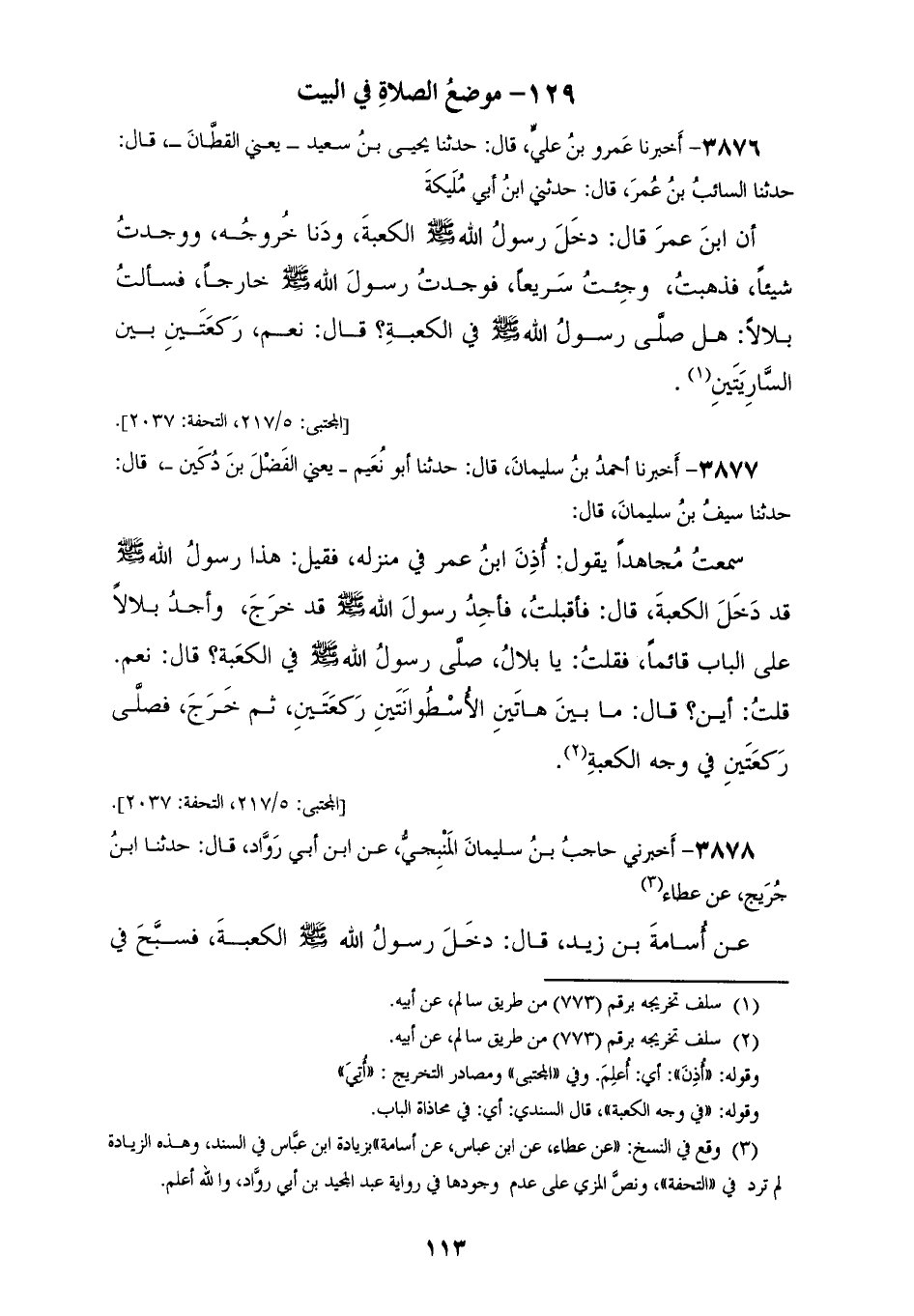 3877 - أَخْبَرَنَا أَحْمَدُ بْنُ سُلَيْمَانَ، قَالَ: حَدَّثَنَا أَبُو نُعَيْمٍ يَعْنِي الْفَضْلَ بْنَ دُكَيْنٍ، قَالَ: حَدَّثَنَا سَيْفُ بْنُ سُلَيْمَانَ، قَالَ: سَمِعْتُ مُجَاهِدًا، يَقُولُ: أَذِنَ ابْنُ عُمَرَ فِي مَنْزِلِهِ، فَقِيلَ: هَذَا رَسُولُ اللهِ صَلَّى اللهُ عَلَيْهِ وَسَلَّمَ قَدْ دَخَلَ الْكَعْبَةَ، قَالَ: فَأَقْبَلْتُ فَأَجِدُ رَسُولَ اللهِ صَلَّى اللهُ عَلَيْهِ وَسَلَّمَ قَدْ خَرَجَ، وَأَجِدُ بِلَالًا عَلَى الْبَابِ قَائِمًا، فَقُلْتُ: يَا بِلَالُ، صَلَّى رَسُولُ اللهِ صَلَّى اللهُ عَلَيْهِ وَسَلَّمَ فِي الْكَعْبَةِ؟ قَالَ: " §نَعَمْ، قُلْتُ: أَيْنَ؟ قَالَ: «مَا بَيْنَ هَاتَيْنِ الْأُسْطُوَانَتَيْنِ رَكْعَتَيْنِ، ثُمَّ خَرَجَ فَصَلَّى رَكْعَتَيْنِ فِي وَجْهِ الْكَعْبَةِ»