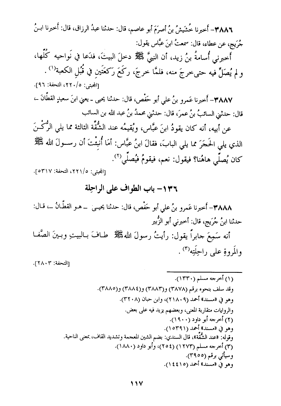 3888 - أَخْبَرَنَا عَمْرُو بْنُ عَلِيٍّ أَبُو حَفْصٍ، قَالَ: حَدَّثَنَا يَحْيَى هُوَ الْقَطَّانُ قَالَ: حَدَّثَنَا ابْنُ جُرَيْجٍ، قَالَ: أَخْبَرَنِي أَبُو الزُّبَيْرِ، أَنَّهُ سَمِعَ جَابِرًا، يَقُولُ: رَأَيْتُ رَسُولَ اللهِ صَلَّى اللهُ عَلَيْهِ وَسَلَّمَ «§طَافَ بِالْبَيْتِ وَبَيْنَ الصَّفَا وَالْمَرْوَةِ عَلَى رَاحِلَتِهِ»