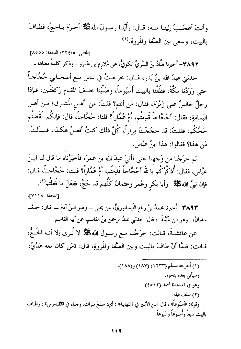 3892 - أَخْبَرَنَا هَنَّادُ بْنُ السَّرِيِّ الْكُوفِيُّ، عَنْ مُلَازِمِ بْنِ عَمْرٍو، وَذَكَرَ كَلِمَةً مَعْنَاهَا حَدَّثَنِي عَبْدُ اللهِ بْنُ بَدْرٍ، قَالَ: خَرَجْتُ فِي نَاسٍ مَعَ أَصْحَابِي حُجَّاجًا حَتَّى وَرَدْنَا مَكَّةَ، فَطُفْنَا بِالْبَيْتِ أُسْبُوعًا، وَصَلَّيْنَا خَلْفَ الْمَقَامِ رَكْعَتَيْنِ، فَإِذَا رَجُلٌ جَالِسٌ عَلَى زَمْزَمَ، فَقَالَ: مَنْ أَنْتُمْ؟ قُلْتُ: مِنْ أَهْلِ الْمَشْرِقِ، مِنْ أَهْلِ الْيَمَامَةِ، فَقَالَ: أَحُجَّاجًا قَدِمْتُمْ أَمْ عُمَّارًا؟ قُلْنَا: حُجَّاجًا، قَالَ: فَإِنَّكُمْ نَقَضْتُمْ حَجَّكُمْ، فَقُلْتُ: قَدْ حَجَجْتُ مِرَارًا كُلَّ ذَلِكَ كُنْتُ أَفْعَلُ هَكَذَا، فَسَأَلْتُ مَنْ هَذَا؟ فَقَالُوا: هَذَا ابْنُ عَبَّاسٍ، ثُمَّ خَرَجْنَا مِنْ وَجْهِنَا حَتَّى نَأْتِيَ عَبْدَ اللهِ بْنَ عُمَرَ فَأَخْبَرْنَاهُ مَا قَالَ لَنَا ابْنُ عَبَّاسٍ: فَقَالَ: أُذَكِّرُكُمْ بِاللهِ، أَحُجَّاجًا قَدِمْتُمْ أَمْ عُمَّارًا؟، قُلْتُ: حُجَّاجًا، قَالَ: «§فَإِنَّ نَبِيَّ اللهِ صَلَّى اللهُ عَلَيْهِ وَسَلَّمَ وَأَبَا بَكْرٍ وَعُمَرَ وَعُثْمَانَ كُلُّهُمْ قَدْ حَجَّ، فَفَعَلَ مَا فَعَلْتُمْ»