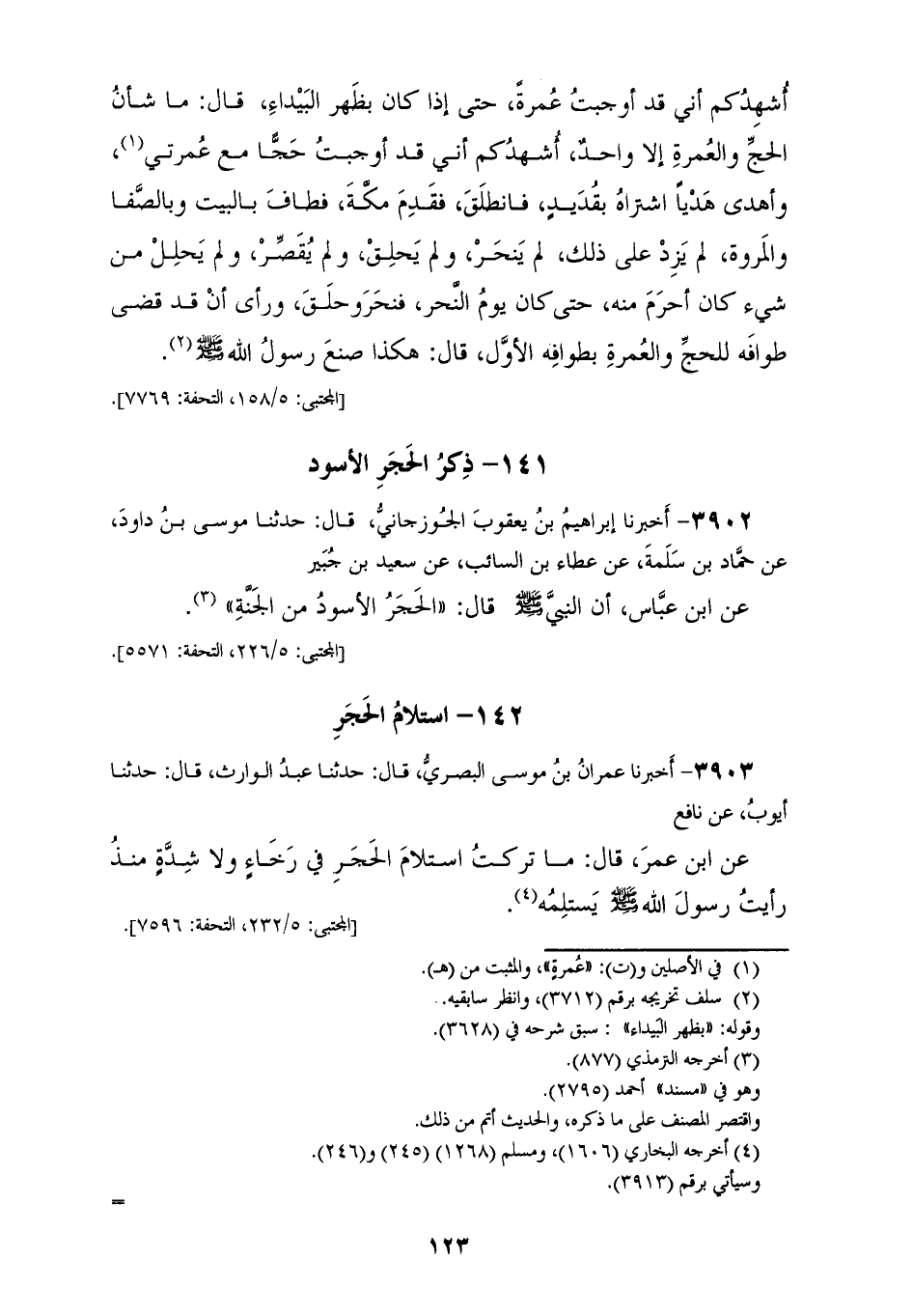 3903 - أَخْبَرَنَا عِمْرَانُ بْنُ مُوسَى الْبَصْرِيُّ، قَالَ: حَدَّثَنَا عَبْدُ الْوَارِثِ، قَالَ: حَدَّثَنَا أَيُّوبُ، عَنْ نَافِعٍ، عَنِ ابْنِ عُمَرَ، قَالَ: «§مَا تَرَكْتُ اسْتِلَامَ الْحَجَرِ فِي رَخَاءٍ وَلَا شِدَّةٍ مُنْذُ رَأَيْتُ رَسُولَ اللهِ صَلَّى اللهُ عَلَيْهِ وَسَلَّمَ يَسْتَلِمُهُ»