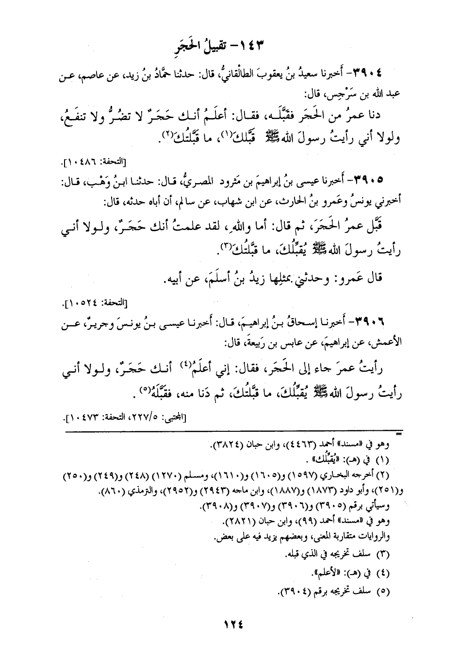 3906 - أَخْبَرَنَا إِسْحَاقُ بْنُ إِبْرَاهِيمَ، قَالَ: أَخْبَرَنَا عِيسَى بْنُ يُونُسَ، وَجَرِيرٌ، عَنِ الْأَعْمَشِ، عَنْ إِبْرَاهِيمَ، عَنْ عَابِسِ بْنِ رَبِيعَةَ، قَالَ: رَأَيْتُ عُمَرَ جَاءَ إِلَى الْحَجَرِ فَقَالَ: إِنِّي أَعْلَمُ أَنَّكَ حَجَرٌ، «§وَلَوْلَا أَنِّي رَأَيْتُ رَسُولَ اللهِ صَلَّى اللهُ عَلَيْهِ وَسَلَّمَ يُقَبِّلُكَ مَا قَبَّلْتُكَ، ثُمَّ دَنَا مِنْهُ فَقَبَّلَهُ»