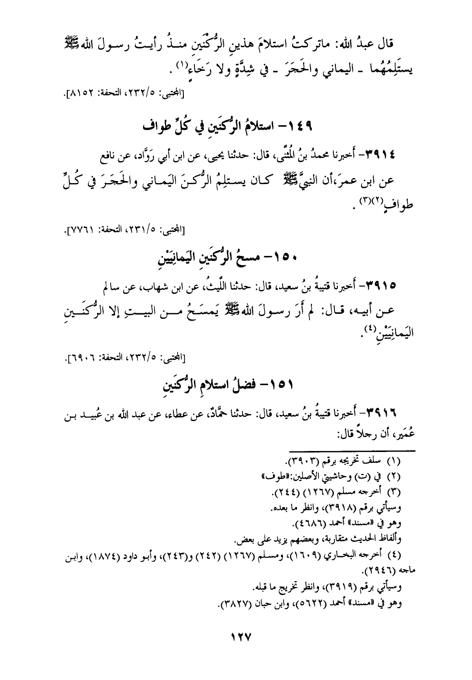 3915 - أَخْبَرَنَا قُتَيْبَةُ بْنُ سَعِيدٍ، قَالَ: حَدَّثَنَا اللَّيْثُ، عَنِ ابْنِ شِهَابٍ، عَنْ سَالِمٍ، عَنْ أَبِيهِ، قَالَ: لَمْ أَرَ رَسُولَ اللهِ صَلَّى اللهُ عَلَيْهِ وَسَلَّمَ «§يَمْسَحُ مِنَ الْبَيْتِ إِلَّا الرُّكْنَيْنِ الْيَمَانِيَّيْنِ»