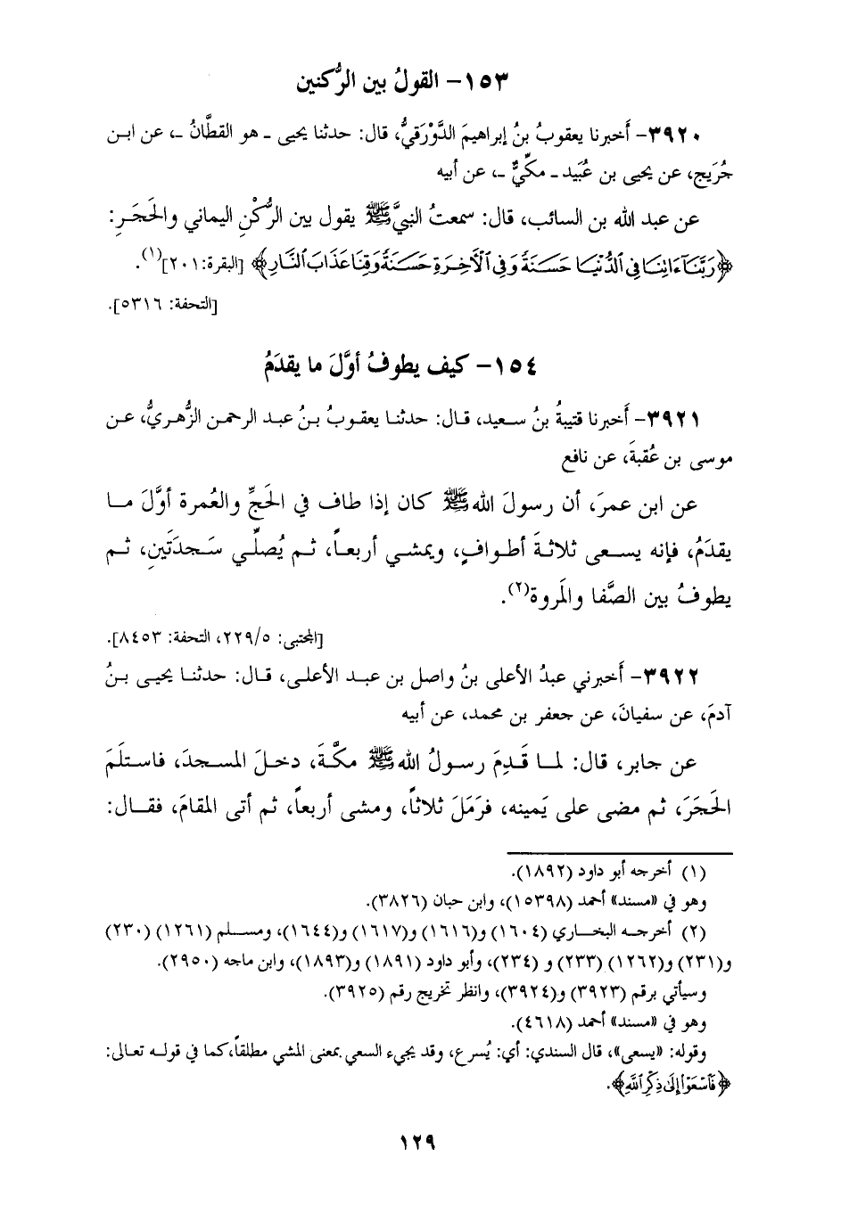 3921 - أَخْبَرَنَا قُتَيْبَةُ بْنُ سَعِيدٍ، قَالَ: حَدَّثَنَا يَعْقُوبُ بْنُ عَبْدِ الرَّحْمَنِ الزُّهْرِيُّ، عَنْ مُوسَى بْنِ عُقْبَةَ، عَنْ نَافِعٍ، عَنِ ابْنِ عُمَرَ، أَنَّ رَسُولَ اللهِ صَلَّى اللهُ عَلَيْهِ وَسَلَّمَ كَانَ «§إِذَا طَافَ فِي الْحَجِّ وَالْعُمْرَةِ أَوَّلَ مَا يَقْدَمُ فَإِنَّهُ يَسْعَى ثَلَاثَةَ أَطْوَافٍ، وَيَمْشِي أَرْبَعًا ثُمَّ يُصَلِّي سَجْدَتَيْنِ، ثُمَّ يَطُوفُ بَيْنَ الصَّفَا وَالْمَرْوَةِ»