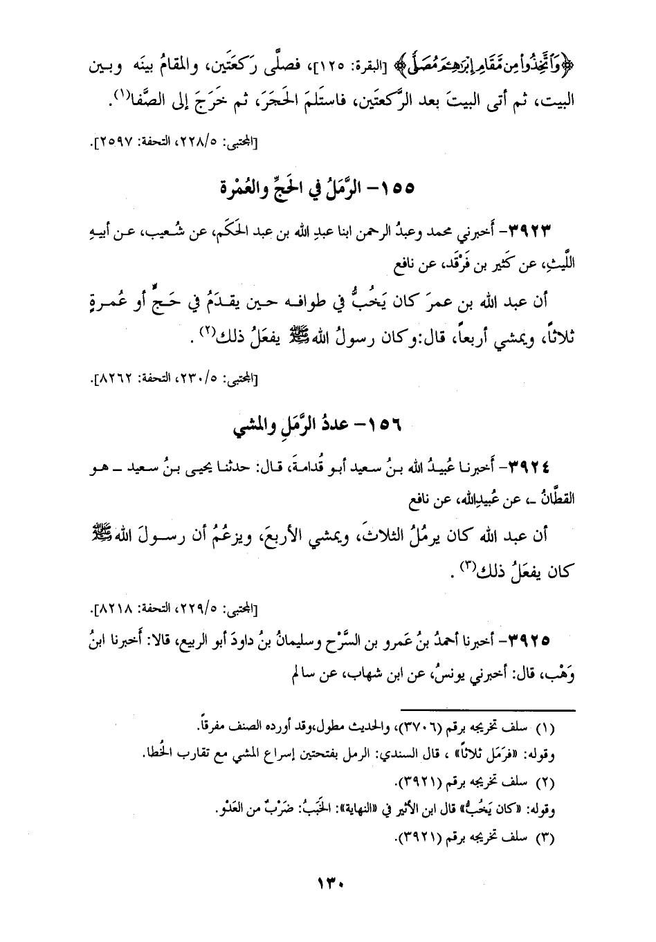 3923 - أَخْبَرَنِي مُحَمَّدٌ، وَعَبْدُ الرَّحْمَنِ، ابنا عَبْدِ اللهِ بْنُ عَبْدِ الْحَكَمِ، عَنْ شُعَيْبٍ، عَنْ أَبِيهِ اللَّيْثِ، عَنْ كَثِيرِ بْنِ فَرْقَدٍ، عَنْ نَافِعٍ، أَنَّ عَبْدَ اللهِ بْنَ عُمَرَ، " §كَانَ يَخُبُّ فِي طَوَافِهِ حِينَ يَقْدَمُ فِي حَجٍّ أَوْ عُمْرَةٍ ثَلَاثًا، وَيَمْشِي أَرْبَعًا، قَالَ: وَكَانَ رَسُولُ اللهِ صَلَّى اللهُ عَلَيْهِ وَسَلَّمَ يَفْعَلُ ذَلِكَ "