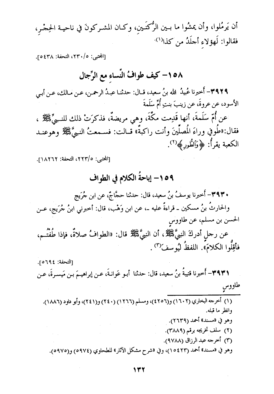 3930 - أَخْبَرَنَا يُوسُفُ بْنُ سَعِيدٍ، قَالَ: حَدَّثَنَا حَجَّاجٌ، عَنِ ابْنِ جُرَيْجٍ، وَالْحَارِثُ بْنُ مِسْكِينٍ، قِرَاءَةً عَلَيْهِ عَنِ ابْنِ وَهْبٍ، قَالَ: أَخْبَرَنِي ابْنُ جُرَيْجٍ، عَنِ الْحَسَنِ بْنِ مُسْلِمٍ، عَنْ طَاوُسٍ، عَنْ رَجُلٍ، أَدْرَكَ النَّبِيَّ صَلَّى اللهُ عَلَيْهِ وَسَلَّمَ أَنَّ النَّبِيَّ صَلَّى اللهُ عَلَيْهِ وَسَلَّمَ قَالَ: «§الطَّوَافُ صَلَاةٌ، فَإِذَا طُفْتُمْ فَأَقِلُّوا الْكَلَامَ» اللَّفْظُ لِيُوسُفَ