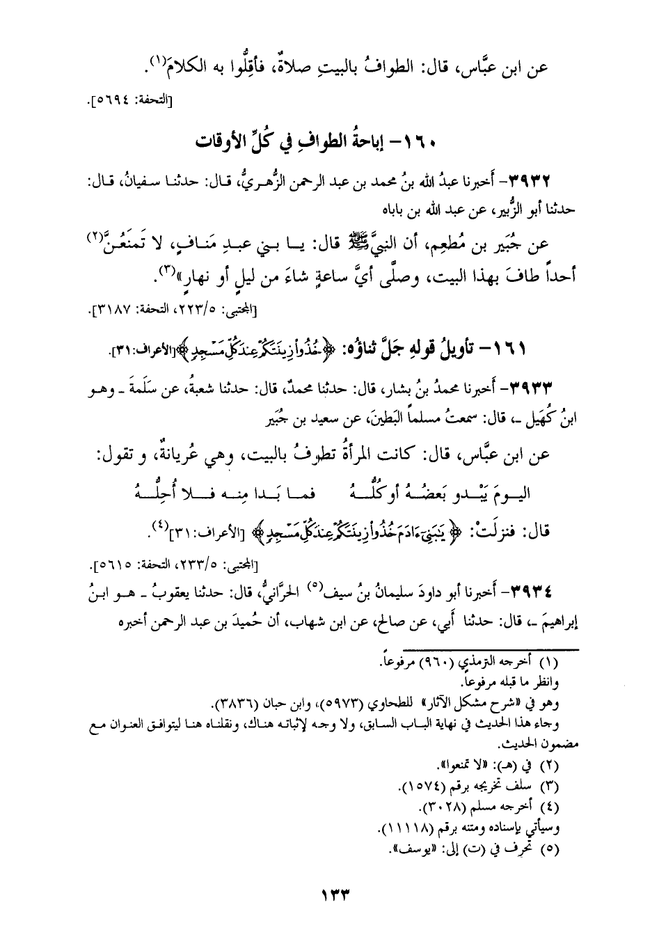 3932 - أَخْبَرَنَا عَبْدُ اللهِ بْنُ مُحَمَّدِ بْنِ عَبْدِ الرَّحْمَنِ الزُّهْرِيُّ، قَالَ: حَدَّثَنَا سُفْيَانُ، قَالَ: حَدَّثَنَا أَبُو الزُّبَيْرِ، عَنْ عَبْدِ اللهِ بْنِ بَابَاهَ، عَنْ جُبَيْرِ بْنِ مُطْعِمٍ، أَنَّ النَّبِيَّ صَلَّى اللهُ عَلَيْهِ وَسَلَّمَ قَالَ: «§يَا بَنِي عَبْدِ مَنَافٍ لَا تَمْنَعُنَّ أَحَدًا طَافَ بِهَذَا الْبَيْتِ وَصَلَّى أَيَّ سَاعَةٍ شَاءَ مِنْ لَيْلٍ أَوْ نَهَارٍ»