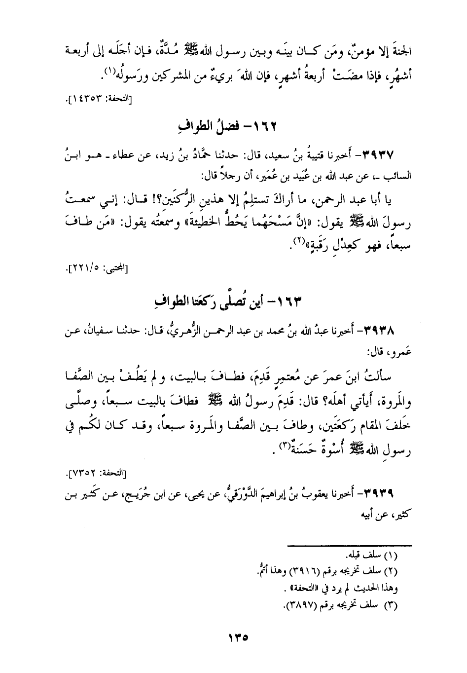 3938 - أَخْبَرَنَا عَبْدُ اللهِ بْنُ مُحَمَّدِ بْنِ عَبْدِ الرَّحْمَنِ الزُّهْرِيُّ، قَالَ: حَدَّثَنَا سُفْيَانُ، عَنْ عَمْرٍو، قَالَ: سَأَلْتُ ابْنَ عُمَرَ، عَنْ مُعْتَمِرٍ، قَدِمَ فَطَافَ بِالْبَيْتِ وَلَمْ يَطُفْ بَيْنَ الصَّفَا وَالْمَرْوَةِ أَيَأْتِي أَهْلَهُ؟ قَالَ: «§قَدِمَ رَسُولُ اللهِ صَلَّى اللهُ عَلَيْهِ وَسَلَّمَ فَطَافَ بِالْبَيْتِ سَبْعًا وَصَلَّى خَلْفَ الْمَقَامِ رَكْعَتَيْنِ وَطَافَ بَيْنَ الصَّفَا وَالْمَرْوَةِ سَبْعًا، وَقَدْ كَانَ لَكُمْ فِي رَسُولِ اللهِ صَلَّى اللهُ عَلَيْهِ وَسَلَّمَ أُسْوَةٌ حَسَنَةٌ»