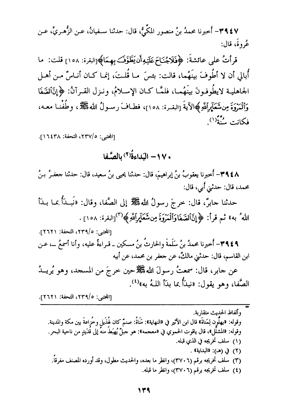 3948 - أَخْبَرَنَا يَعْقُوبُ بْنُ إِبْرَاهِيمَ، قَالَ: حَدَّثَنَا يَحْيَى بْنُ سَعِيدٍ، قَالَ: حَدَّثَنَا جَعْفَرُ بْنُ مُحَمَّدٍ، قَالَ: حَدَّثَنِي أَبِي قَالَ: حَدَّثَنَا جَابِرٌ، قَالَ: خَرَجَ رَسُولُ اللهِ صَلَّى اللهُ عَلَيْهِ وَسَلَّمَ إِلَى الصَّفَا وَقَالَ: " §نَبْدَأُ بِمَا بَدَأَ اللهُ بِهِ، ثُمَّ قَرَأَ {إِنَّ الصَّفَا وَالْمَرْوَةَ مِنْ شَعَائِرِ اللهِ} [البقرة: 158]