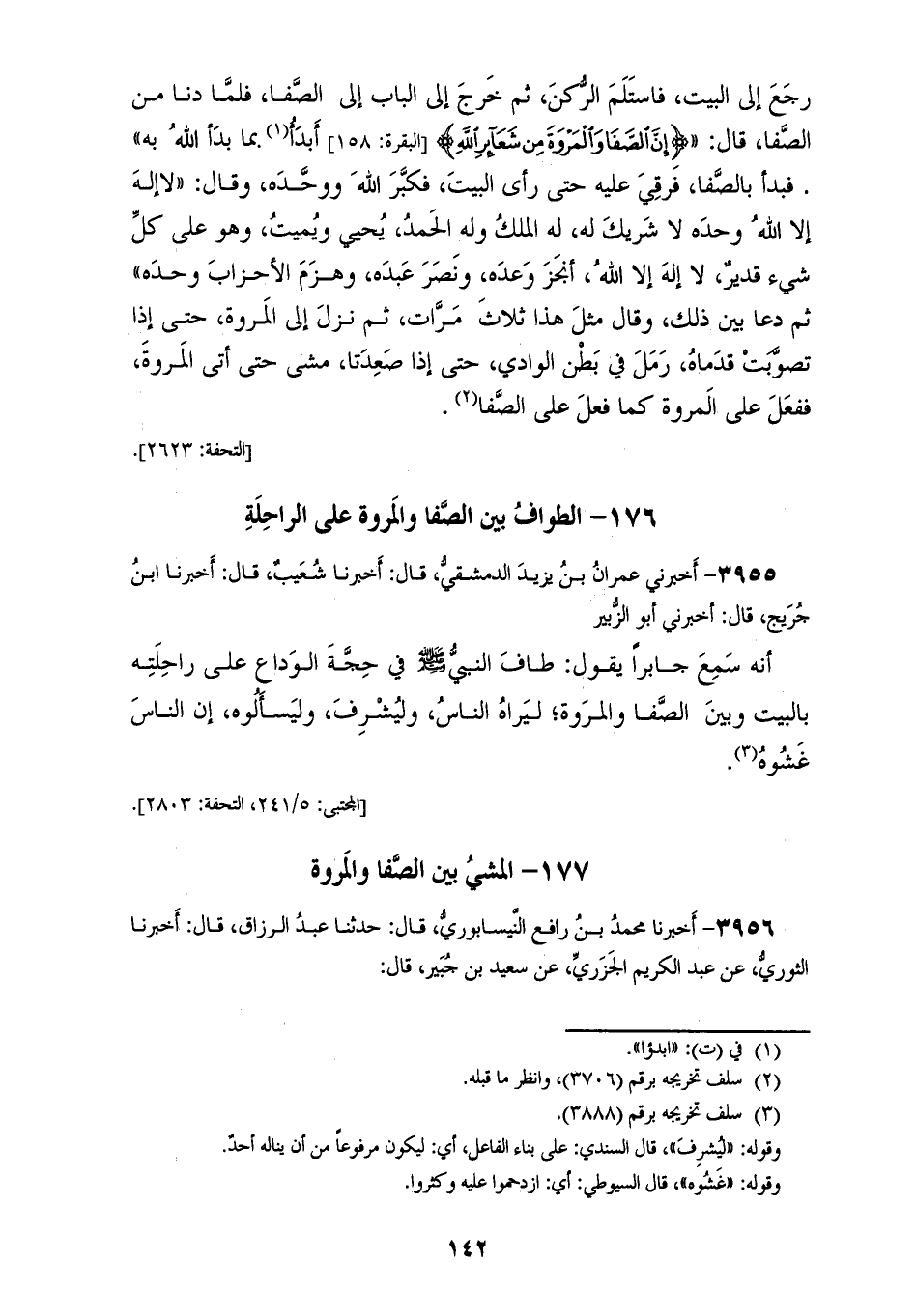3956 - أَخْبَرَنَا مُحَمَّدُ بْنُ رَافِعٍ النَّيْسَابُورِيُّ، قَالَ: حَدَّثَنَا عَبْدُ الرَّزَّاقِ، قَالَ: أَخْبَرَنَا الثَّوْرِيُّ، عَنْ عَبْدِ الْكَرِيمِ الْجَزَرِيِّ، عَنْ سَعِيدِ بْنِ جُبَيْرٍ، قَالَ: رَأَيْتُ ابْنَ عُمَرَ يَمْشِي بَيْنَ الصَّفَا وَالْمَرْوَةِ، ثُمَّ قَالَ: «§إِنْ مَشَيْتُ فَقَدْ رَأَيْتُ رَسُولَ اللهِ صَلَّى اللهُ عَلَيْهِ وَسَلَّمَ يَمْشِي، وَإِنْ سَعَيْتُ فَقَدْ رَأَيْتُ رَسُولَ اللهِ صَلَّى اللهُ عَلَيْهِ وَسَلَّمَ يَسْعَى»