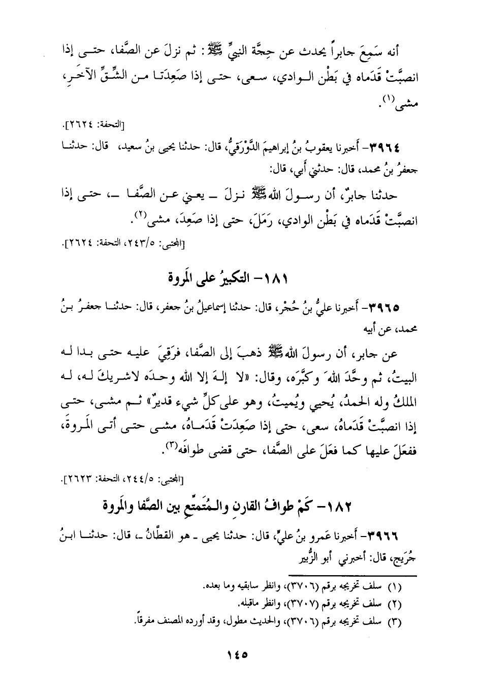 3965 - أَخْبَرَنَا عَلِيُّ بْنُ حُجْرٍ، قَالَ: حَدَّثَنَا إِسْمَاعِيلُ بْنُ جَعْفَرٍ، قَالَ: حَدَّثَنَا جَعْفَرُ بْنُ مُحَمَّدٍ، عَنْ أَبِيهِ، عَنْ جَابِرٍ، أَنَّ رَسُولَ اللهِ صَلَّى اللهُ عَلَيْهِ وَسَلَّمَ ذَهَبَ إِلَى الصَّفَا فَرَقِيَ عَلَيْهِ حَتَّى بَدَا لَهُ الْبَيْتُ، ثُمَّ وَحَّدَ اللهَ وَكَبَّرَهُ، وَقَالَ: «§لَا إِلَهَ إِلَّا اللهُ وَحْدَهُ لَا شَرِيكَ لَهُ لَهُ الْمُلْكُ، وَلَهُ الْحَمْدُ يُحْيِي وَيُمِيتُ وَهُوَ عَلَى كُلِّ شَيْءٍ قَدِيرٌ، ثُمَّ مَشَى حَتَّى إِذَا انْصَبَّتْ قَدَمَاهُ سَعَى، حَتَّى إِذَا صَعِدَتْ قَدَمَاهُ مَشَى، حَتَّى أَتَى الْمَرْوَةَ فَفَعَلَ عَلَيْهَا كَمَا فَعَلَ عَلَى الصَّفَا حَتَّى قَضَى طَوَافَهُ»