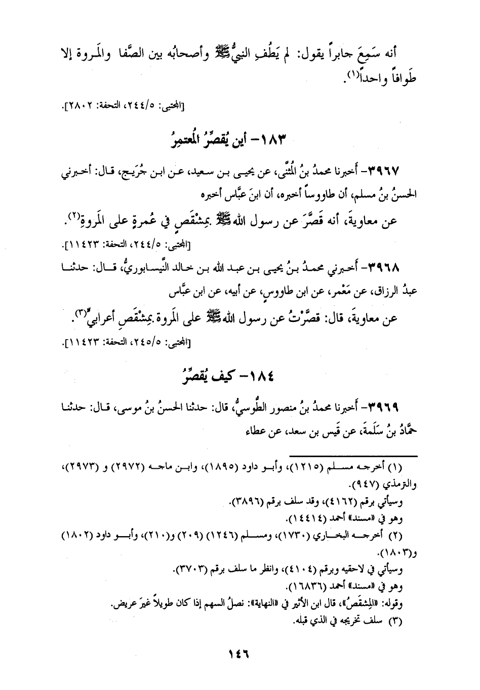 3968 - أَخْبَرَنِي مُحَمَّدُ بْنُ يَحْيَى بْنِ عَبْدِ اللهِ بْنِ خَالِدٍ النَّيْسَابُورِيُّ، قَالَ: حَدَّثَنَا عَبْدُ الرَّزَّاقِ، عَنْ مَعْمَرٍ، عَنِ ابْنِ طَاوُسٍ، عَنْ أَبِيهِ، عَنِ ابْنِ عَبَّاسٍ، عَنْ مُعَاوِيَةَ، قَالَ: «§قَصَّرْتُ عَنْ رَسُولِ اللهِ صَلَّى اللهُ عَلَيْهِ وَسَلَّمَ عَلَى الْمَرْوَةِ بِمِشْقَصِ أَعْرَابِيٍّ»