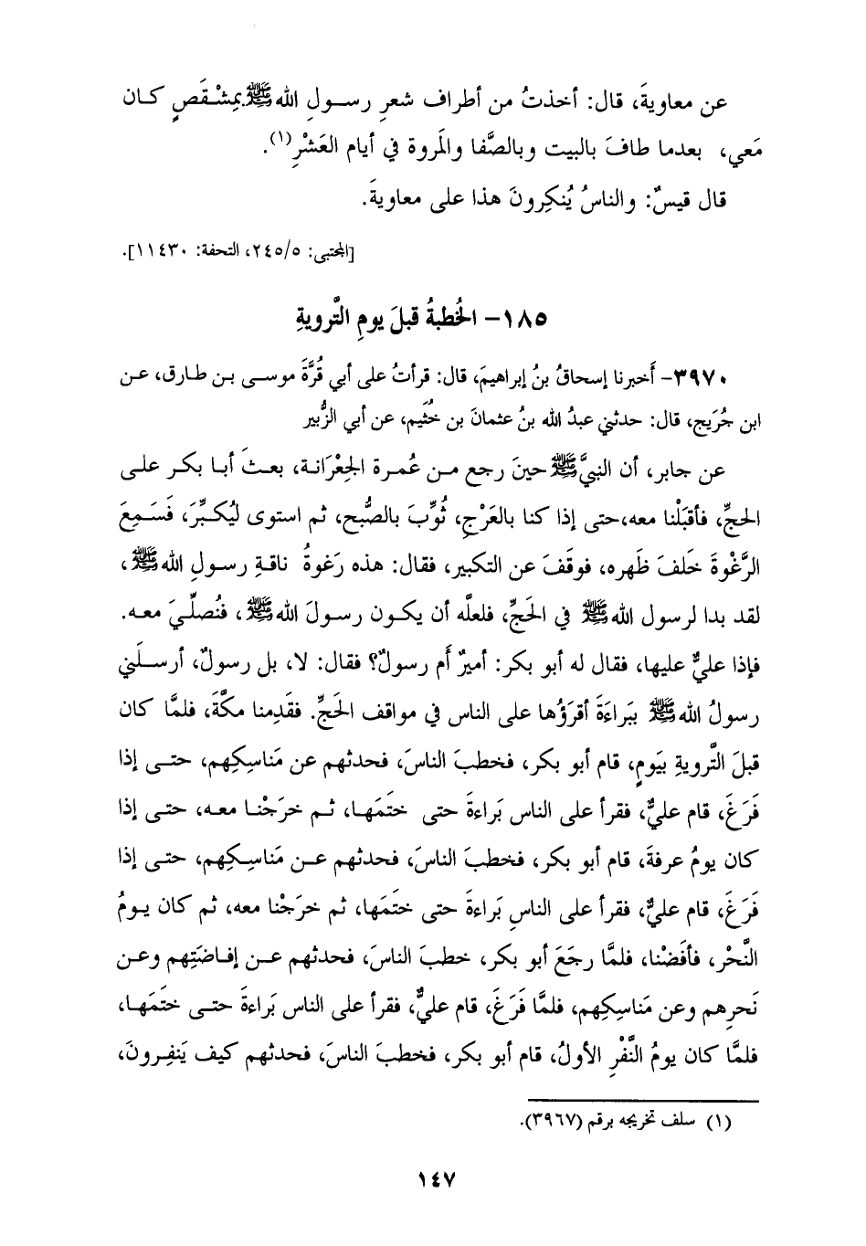 3970 - أَخْبَرَنَا إِسْحَاقُ بْنُ إِبْرَاهِيمَ، قَالَ: قَرَأْتُ عَلَى أَبِي قُرَّةَ مُوسَى بْنِ طَارِقٍ، عَنِ ابْنِ جُرَيْجٍ، قَالَ: حَدَّثَنِي عَبْدُ اللهِ بْنُ عُثْمَانَ بْنِ خُثَيْمٍ، عَنْ أَبِي الزُّبَيْرِ، عَنْ جَابِرٍ، أَنَّ النَّبِيَّ صَلَّى اللهُ عَلَيْهِ وَسَلَّمَ حِينَ رَجَعَ مِنْ عُمْرَةِ الْجِعِرَّانَةِ بَعَثَ أَبَا بَكْرٍ عَلَى الْحَجِّ، فَأَقْبَلْنَا مَعَهُ حَتَّى إِذَا كُنَّا بِالْعَرْجِ ثَوَّبَ بِالصُّبْحِ، ثُمَّ اسْتَوَى لِيُكَبِّرَ فَسَمِعَ الرَّغْوَةَ، خَلْفَ ظَهْرِهِ، فَوَقَفَ عَنِ التَّكْبِيرِ، فَقَالَ: هَذِهِ رَغْوَةُ نَاقَةِ رَسُولِ اللهِ صَلَّى اللهُ عَلَيْهِ وَسَلَّمَ، لَقَدْ بَدَا لِرَسُولِ اللهِ صَلَّى اللهُ عَلَيْهِ وَسَلَّمَ فِي الْحَجِّ فَلَعَلَّهُ أَنْ يَكُونَ رَسُولُ اللهِ صَلَّى اللهُ عَلَيْهِ وَسَلَّمَ فَنُصَلِّي مَعَهُ، فَإِذَا عَلِيٌّ عَلَيْهَا، فَقَالَ لَهُ أَبُو بَكْرٍ: أَمِيرٌ أَمْ رَسُولٌ؟ فَقَالَ: لَا، بَلْ رَسُولٌ «§أَرْسَلَنِي رَسُولُ اللهِ صَلَّى اللهُ عَلَيْهِ وَسَلَّمَ بِبَرَاءَةَ أَقْرَؤُهَا عَلَى النَّاسِ فِي مَوَاقِفِ الْحَجِّ، فَقَدِمْنَا مَكَّةَ، فَلَمَّا كَانَ قَبْلَ التَّرْوِيَةِ بِيَوْمٍ قَامَ أَبُو بَكْرٍ فَخَطَبَ النَّاسَ فَحَدَّثَهُمْ عَنْ مَنَاسِكِهِمْ، حَتَّى إِذَا فَرَغَ قَامَ عَلِيٌّ فَقَرَأَ عَلَى النَّاسِ بَرَاءَةَ حَتَّى خَتَمَهَا، ثُمَّ خَرَجْنَا مَعَهُ حَتَّى إِذَا كَانَ يَوْمُ عَرَفَةَ قَامَ أَبُو بَكْرٍ فَخَطَبَ النَّاسَ فَحَدَّثَهُمْ عَنْ مَنَاسِكِهِمْ، حَتَّى إِذَا فَرَغَ قَامَ عَلِيٌّ فَقَرَأَ عَلَى النَّاسِ بَرَاءَةَ حَتَّى خَتَمَهَا، ثُمَّ خَرَجْنَا مَعَهُ، ثُمَّ كَانَ يَوْمُ النَّحْرِ فَأَفَضْنَا، فَلَمَّا رَجَعَ أَبُو بَكْرٍ خَطَبَ النَّاسَ فَحَدَّثَهُمْ عَنْ إِفَاضَتِهِمْ وَعَنْ نَحْرِهِمْ وَعَنْ مَنَاسِكِهِمْ، فَلَمَّا فَرَغَ قَامَ عَلِيٌّ فَقَرَأَ عَلَى النَّاسِ بَرَاءَةَ حَتَّى خَتَمَهَا، فَلَمَّا كَانَ يَوْمُ النَّفْرِ الْأَوَّلُ قَامَ أَبُو بَكْرٍ فَخَطَبَ النَّاسَ فَحَدَّثَهُمْ كَيْفَ يَنْفِرُونَ وَكَيْفَ يَرْمُونَ، فَعَلَّمَهُمْ مَنَاسِكَهُمْ، فَلَمَّا فَرَغَ قَامَ عَلِيٌّ فَقَرَأَ بَرَاءَةَ عَلَى النَّاسِ حَتَّى خَتَمَهَا»