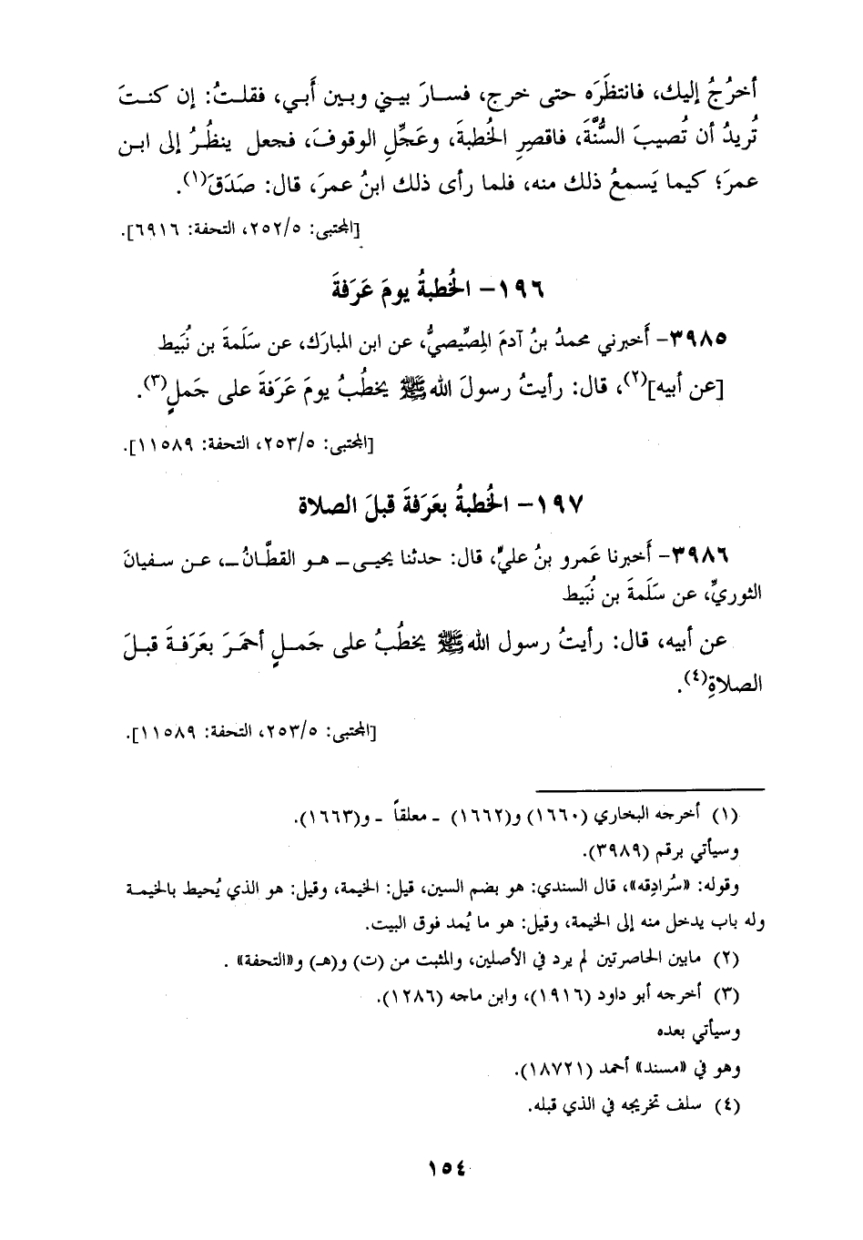 3986 - أَخْبَرَنَا عَمْرُو بْنُ عَلِيٍّ، قَالَ: حَدَّثَنَا يَحْيَى هُوَ الْقَطَّانُ، عَنْ سُفْيَانَ الثَّوْرِيِّ، عَنْ سَلَمَةَ بْنِ نُبَيْطٍ، عَنْ أَبِيهِ، قَالَ: رَأَيْتُ رَسُولَ اللهِ صَلَّى اللهُ عَلَيْهِ وَسَلَّمَ «§يَخْطُبُ عَلَى جَمَلٍ أَحْمَرَ بِعَرَفَةَ قَبْلَ الصَّلَاةِ»