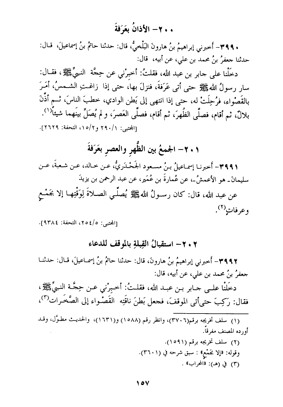 3992 - أَخْبَرَنِي إِبْرَاهِيمُ بْنُ هَارُونَ، قَالَ: حَدَّثَنَا حَاتِمُ بْنُ إِسْمَاعِيلَ، قَالَ: حَدَّثَنَا جَعْفَرُ بْنُ مُحَمَّدِ بْنِ عَلِيٍّ، عَنْ أَبِيهِ، قَالَ: دَخَلْنَا عَلَى جَابِرِ بْنِ عَبْدِ اللهِ فَقُلْتُ: أَخْبِرْنِي عَنْ حَجَّةِ النَّبِيِّ صَلَّى اللهُ عَلَيْهِ وَسَلَّمَ، فَقَالَ: «§رَكِبَ حَتَّى أَتَى الْمَوْقِفَ، فَجَعَلَ بَطْنَ نَاقَتِهِ الْقَصْوَاءِ إِلَى الصَّخَرَاتِ، وَجَعَلَ جَبَلَ الْمُشَاةِ بَيْنَ يَدَيْهِ، وَاسْتَقْبَلَ الْقِبْلَةَ، فَلَمْ يَزَلْ وَاقِفًا حَتَّى غَرَبَتِ الشَّمْسُ، وَذَهَبَتِ الصُّفْرَةُ قَلِيلًا حِينَ غَابَ الْقُرْصُ»
