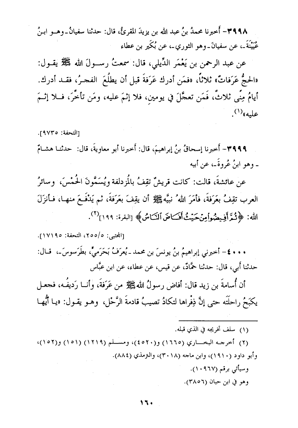 3998 - أَخْبَرَنَا مُحَمَّدُ بْنُ عَبْدِ اللهِ بْنِ يَزِيدَ الْمُقْرِئُ، قَالَ: حَدَّثَنَا سُفْيَانُ وَهُوَ ابْنُ عُيَيْنَةَ، عَنْ سُفْيَانَ وَهُوَ الثَّوْرِيُّ، عَنْ بُكَيْرِ بْنِ عَطَاءٍ، عَنْ عَبْدِ الرَّحْمَنِ بْنِ يَعْمُرَ الدِّيلِيِّ، قَالَ: سَمِعْتُ رَسُولَ اللهِ صَلَّى اللهُ عَلَيْهِ وَسَلَّمَ يَقُولُ: «§الْحَجُّ عَرَفَاتٌ» ثَلَاثًا «فَمَنْ أَدْرَكَ عَرَفَةَ قَبْلَ أَنْ يَطْلُعَ الْفَجْرُ فَقَدْ أَدْرَكَ، أَيَّامُ مِنًى ثَلَاثٌ فَمَنْ تَعَجَّلَ فِي يَوْمَيْنِ، فَلَا إِثْمَ عَلَيْهِ وَمَنْ تَأَخَّرَ فَلَا إِثْمَ عَلَيْهِ»