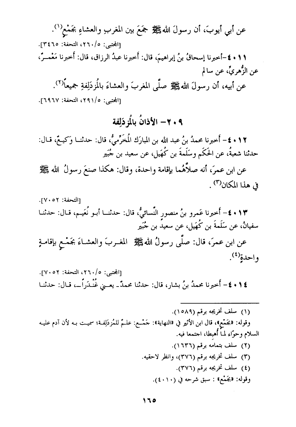 4011 - أَخْبَرَنَا إِسْحَاقُ بْنُ إِبْرَاهِيمَ، قَالَ: أَخْبَرَنَا عَبْدُ الرَّزَّاقِ، قَالَ: أَخْبَرَنَا مَعْمَرٌ، عَنِ الزُّهْرِيِّ، عَنْ سَالِمٍ، عَنْ أَبِيهِ: أَنَّ رَسُولَ اللهِ صَلَّى اللهُ عَلَيْهِ وَسَلَّمَ «§صَلَّى الْمَغْرِبَ وَالْعِشَاءَ بِالْمُزْدَلِفَةِ جَمِيعًا»