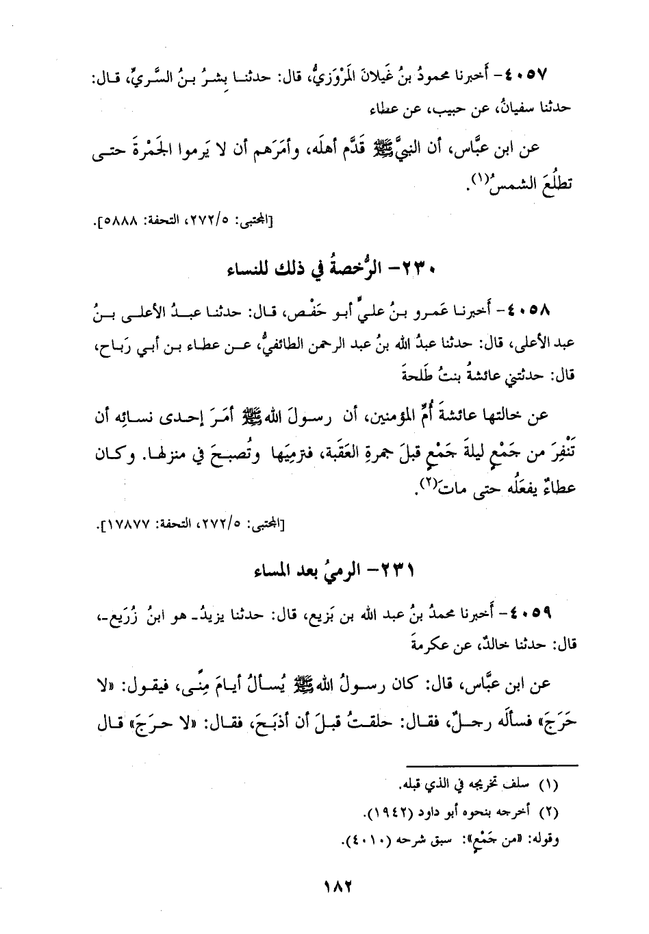 4057 - أَخْبَرَنَا مَحْمُودُ بْنُ غَيْلَانَ الْمَرْوَزِيُّ، قَالَ: حَدَّثَنَا بِشْرُ بْنُ السَّرِيِّ، قَالَ: حَدَّثَنَا سُفْيَانُ، عَنْ حَبِيبٍ، عَنْ عَطَاءٍ، عَنِ ابْنِ عَبَّاسٍ، أَنَّ النَّبِيَّ صَلَّى اللهُ عَلَيْهِ وَسَلَّمَ «§قَدَّمَ أَهْلَهُ وَأَمَرَهُمْ أَنْ لَا يَرْمُوا الْجَمْرَةَ حَتَّى تَطْلُعَ الشَّمْسُ»