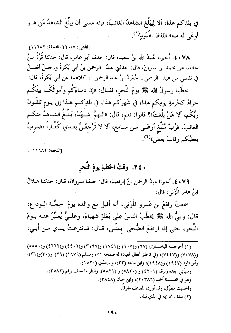 4078 - أَخْبَرَنَا عُبَيْدُ اللهِ بْنُ سَعِيدٍ، قَالَ: حَدَّثَنَا أَبُو عَامِرٍ، قَالَ: حَدَّثَنَا قُرَّةُ بْنُ خَالِدٍ، عَنْ مُحَمَّدِ بْنِ سِيرِينَ، قَالَ: حَدَّثَنِي عَبْدُ الرَّحْمَنِ بْنُ أَبِي بَكْرَةَ، وَرَجُلٌ أَفْضَلُ فِي نَفْسِي مِنْ عَبْدِ الرَّحْمَنِ حُمَيْدُ بْنُ عَبْدِ الرَّحْمَنِ، كِلَاهُمَا عَنْ أَبِي بَكْرَةَ، قَالَ: خَطَبَنَا رَسُولُ اللهِ صَلَّى اللهُ عَلَيْهِ وَسَلَّمَ يَوْمَ النَّحْرِ، فَقَالَ: «§إِنَّ دِمَاءَكُمْ وَأَمْوَالَكُمْ بَيْنَكُمْ حَرَامٌ كَحُرْمَةِ يَوْمِكُمْ هَذَا فِي شَهْرِكُمْ هَذَا فِي بَلَدِكُمْ هَذَا إِلَى يَوْمِ تَلْقَوْنَ رَبِّكُمْ، أَلَا هَلْ بَلَّغْتُ؟» قَالُوا: نَعَمْ، قَالَ: «اللهُمَّ اشْهَدْ» يُبَلِّغُ الشَّاهِدُ مِنْكُمُ الْغَائِبَ، فَرُبَّ مُبَلَّغٍ أَوْعَى مِنْ سَامِعٍ، أَلَا لَا تَرْجِعُنَّ بَعْدِي كُفَّارًا يَضْرِبُ بَعْضُكُمْ رِقَابَ بَعْضٍ "
