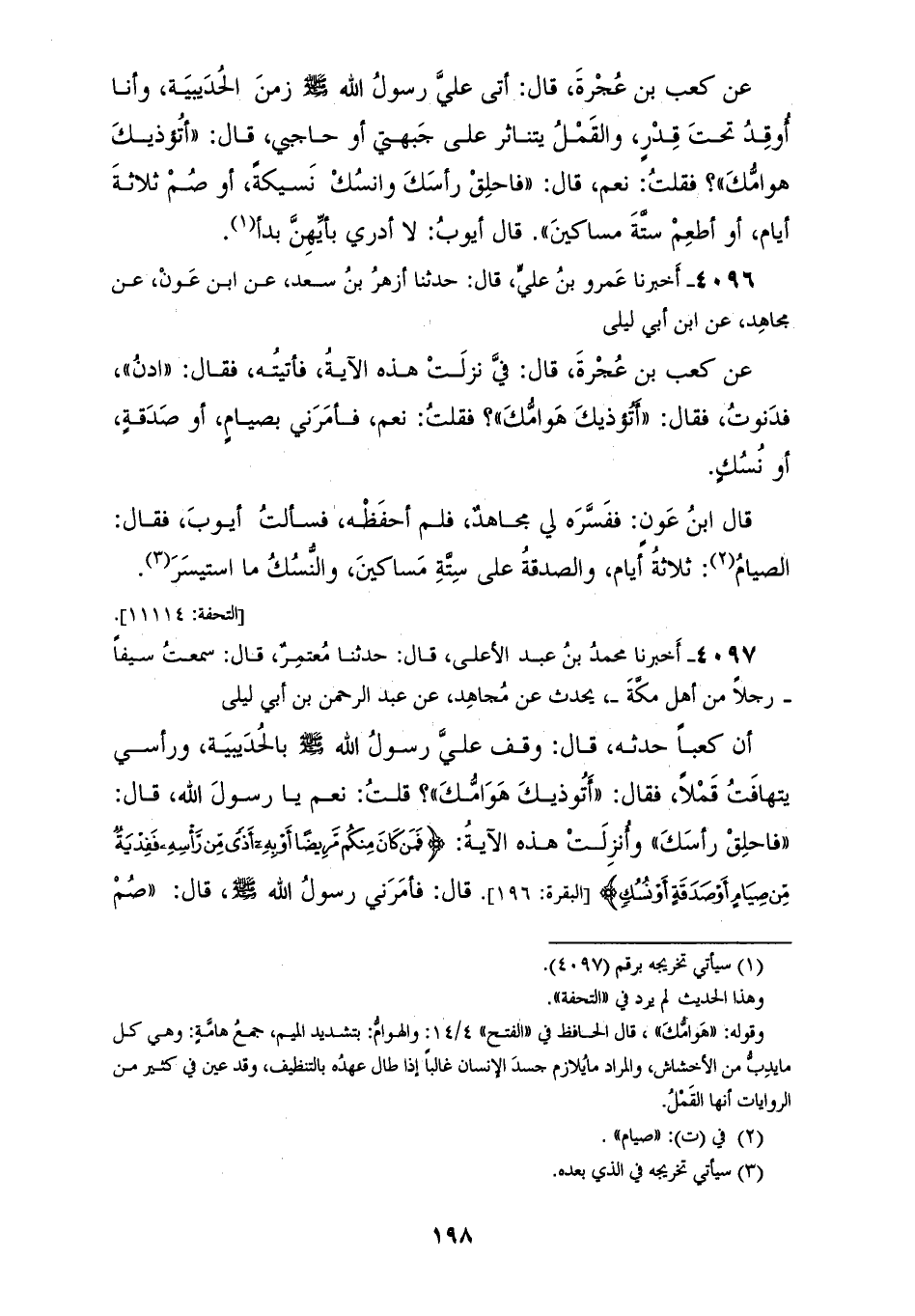 4097 - أَخْبَرَنَا مُحَمَّدُ بْنُ عَبْدِ الْأَعْلَى، قَالَ: حَدَّثَنَا مُعْتَمِرٌ، قَالَ: سَمِعْتُ سَيْفًا، رَجُلًا مِنْ أَهْلِ مَكَّةَ يُحَدِّثُ عَنْ مُجَاهِدٍ، عَنْ عَبْدِ الرَّحْمَنِ بْنِ أَبِي لَيْلَى، أَنَّ كَعْبًا، حَدَّثَهُ قَالَ: وَقَفَ عَلَيَّ رَسُولُ اللهِ صَلَّى اللهُ عَلَيْهِ وَسَلَّمَ بِالْحُدَيْبِيَةِ وَرَأْسِي يَتَهَافَتُ قَمْلًا، فَقَالَ: «أَتُؤْذِيكَ هَوَامُّكَ؟» قُلْتُ: نَعَمْ يَا رَسُولَ اللهِ، قَالَ: «§فَاحْلِقْ رَأْسَكَ» وَأُنْزِلَتْ هَذِهِ الْآيَةُ {فَمَنْ كَانَ مِنْكُمْ مَرِيضًا أَوْ بِهِ أَذًى مِنْ رَأْسِهِ فَفِدْيَةٌ مِنْ صِيَامٍ أَوْ صَدَقَةٍ أَوْ نُسُكٍ} [البقرة: 196] قَالَ: فَأَمَرَنِي رَسُولُ اللهِ صَلَّى اللهُ عَلَيْهِ وَسَلَّمَ قَالَ: " صُمْ ثَلَاثَةَ أَيَّامٍ أَوْ تَصَدَّقْ بِفَرَقٍ بَيْنَ سِتَّةٍ أَوْ شَاةٍ مَا تَيَسَّرَ، قَالَ: وَأَنْزِلَ اللهُ فِيهِ هَذَا "